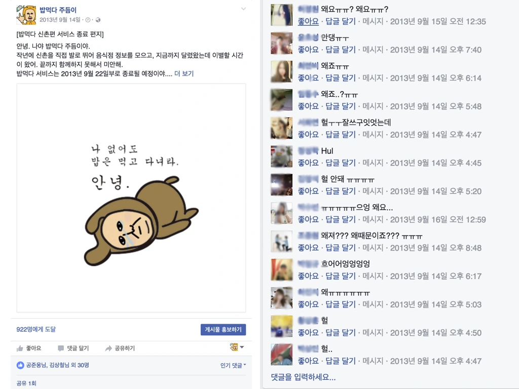 12년도 말에 밥먹다 신촌편이라는 앱을 만들었고 10개월 차에 내렸다. 천여 명 남짓의 학생들이 쓰고 있었는데, 우리는 피봇을 해서 선택과 집중을 하겠다는 중이어서 앱을 내리기로 결정했었다.