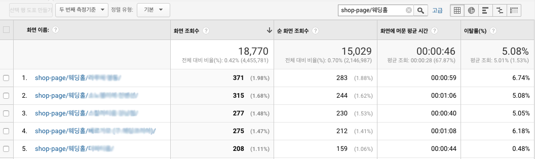 업체 소개 페이지 중 웨딩홀 카테고리만 비교해보고 싶다면 'shop-page/웨딩홀'을 검색해보면 아래와 같이 볼 수 있게 된다.
