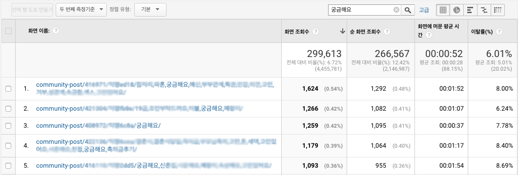 이런 식으로 나오도록 세팅한다. 이렇게 해야만 좋은 건 아니고 이건 개취(개인의 취향)에 가깝다. 이렇게 해당 화면의 온갖 정보를 때려박으면 개발자에게 쿼리 돌려달라는 부탁이 줄어든다. '지난 몇 주간 '궁금해요'라는 태그로 작성된 글 개수가 어떻게 되나요?'라고 데이터를 의뢰하는 대신 구글 애널리틱스에서 기간 설정하고 '궁금해요' 검색하면 된다. '궁금해요'가 포함된 모든 화면에 대한 총지표는 테이블 최상단에 나온다.
