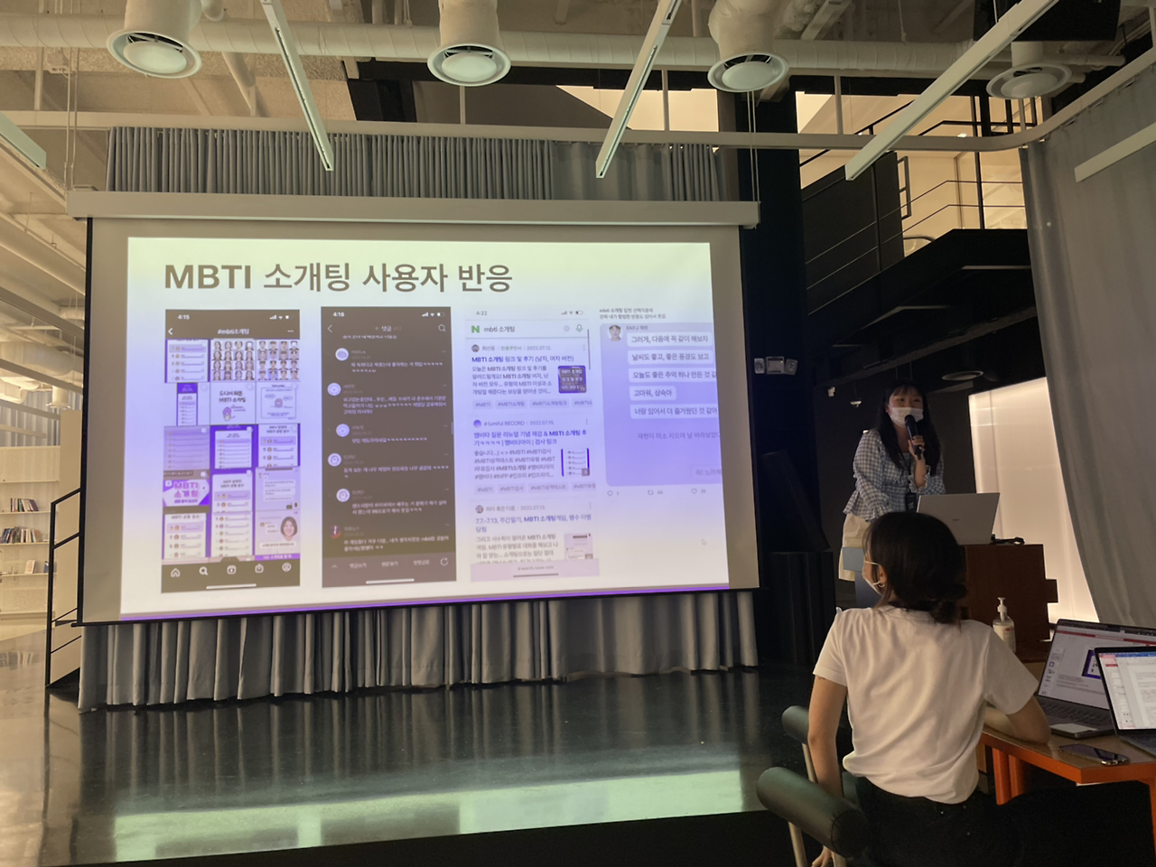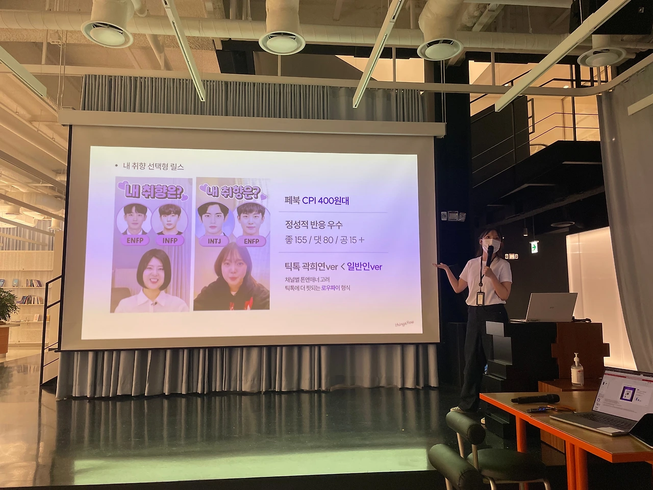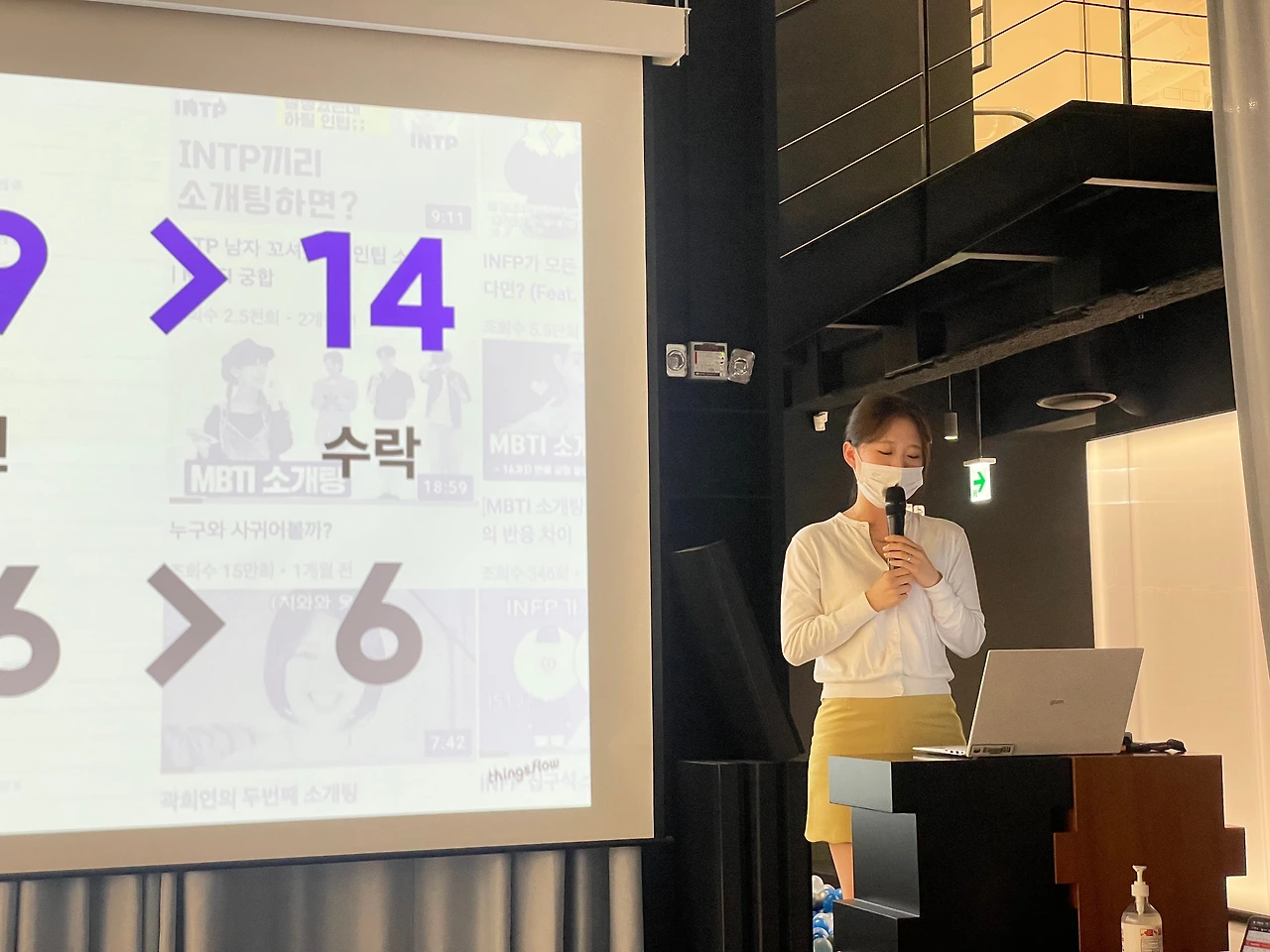재원: 저는 마케터 중 마지막으로 스트리머를 통한 Testimonial 효과 사례를 발표하겠습니다. 내가 좋아하는 연예인이나 셀럽이 좋아하면 신뢰도 효과가 올라가는 것인데요. MBTI, 소개팅, 연애라는 키워드로 적정한 인플루언서를 써칭 했어요. 초반에 의뢰했던 방송들 하나하나가 바이럴의 씨앗이 되었습니다. 이후에는 3일 동안 자연 바이럴이 되어 40명 정도 스트리머가 방송을 한 주말도 있었어요. 마케팅 그룹 발표를 마치겠습니다.