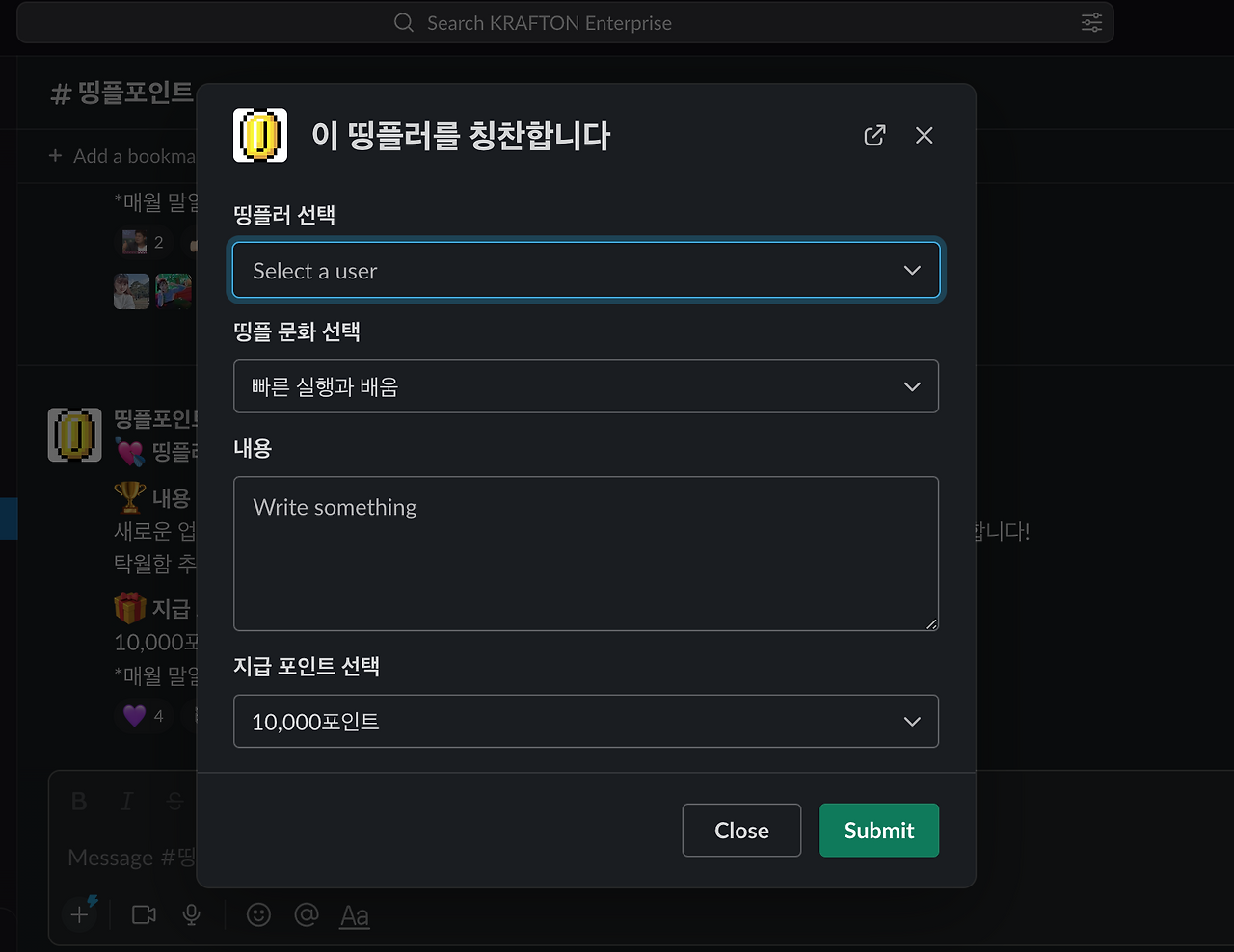 최근에 조직 문화 전파에 레버리지가 높았던 액션 중 하나로 '띵플포인트'도 있다. 슬랙 채널에 워크 플로우 세팅하고, 1인당 1만 원 예산을 맥스로 잡는 결정으로 문화 우수 사례를 쌓고 있다. 동료에게 고마운 순간, 회사가 중시하는 문화를 연결해서 1만 원을 선물할 서 있다. 이런 순간들이 쌓여나가면 워크플로우를 세팅한 30분이 앞으로 자동으로 만들어낼 문화 전파의 효과는 더 클 것이다. 지금이 레버리지 높은 방식으로 조직의 메시지를 전달하고, 적용해둔 프로세스들이 미래 더 큰 조직을 지탱하는 인프라가 될 것이라 생각한다.