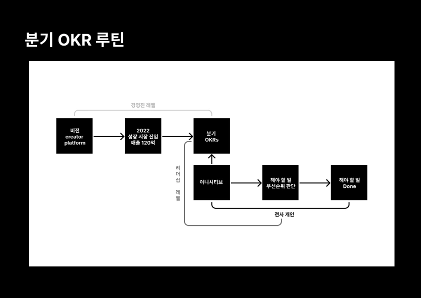 "맨날 OKR, OKR. 성과, 성과. 같은 소리만 반복"이라는 볼멘소리도 들었다. 하지만 일하는 방식과 핵심 가치의 반복은 부작용보다 순기능이 더 크다고 보고 있다. 왜냐하면, 볼멘소리와 괴로움에도 불구하고 위임 수준 내 자율성을 가지고 과업을 만들고 실행해가는 팀원들이 스스로 핵심 결과에 도착하고 있다. 보완이 필요하지만 집중의 효과는 확실하다.