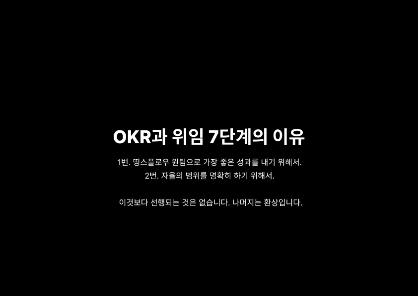 띵스플로우는 목표 결과를 업무의 중심에 두고 일한다. 결과 지향적인 방식을 채택하고 있다. 과정은 상위자의 제안 범위와 결정한 위임 수준 내에서 자율적이다. 가장 중요한 결과를 내기 위해 가장 임팩트 있는 결정을 하면 된다. 하고 싶은 일이 아니라 해야만 하는 일을 집요하게 알아내야 한다.