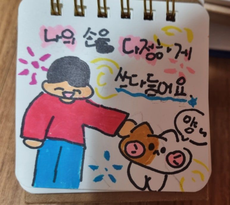 펜을 가져와 쓱쓱 그리고 따라 씁니다.
