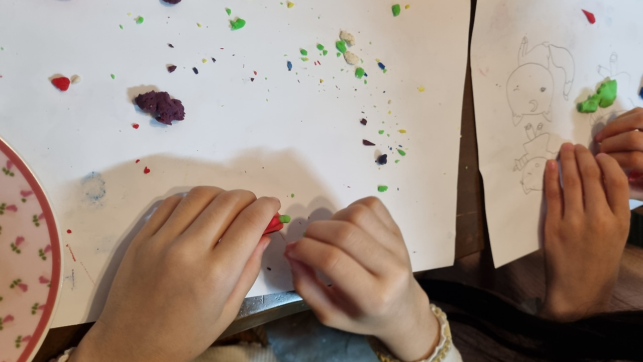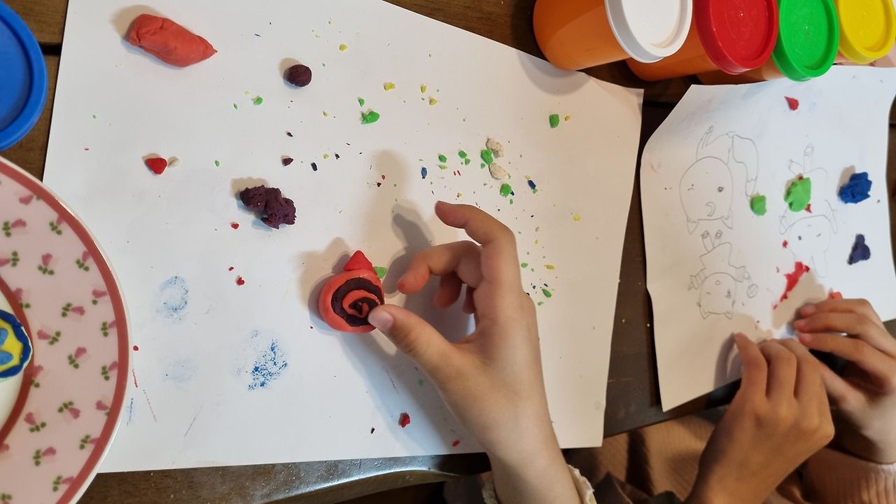 학교에서 받아온 클레이로 케이크를 만들 거라며 판을 벌립니다.