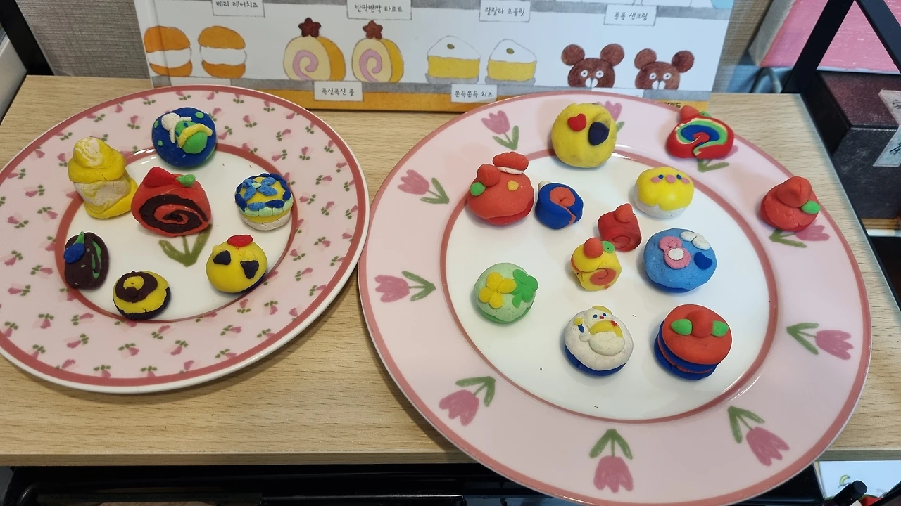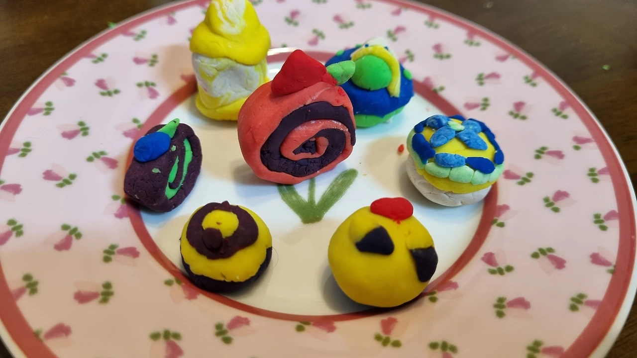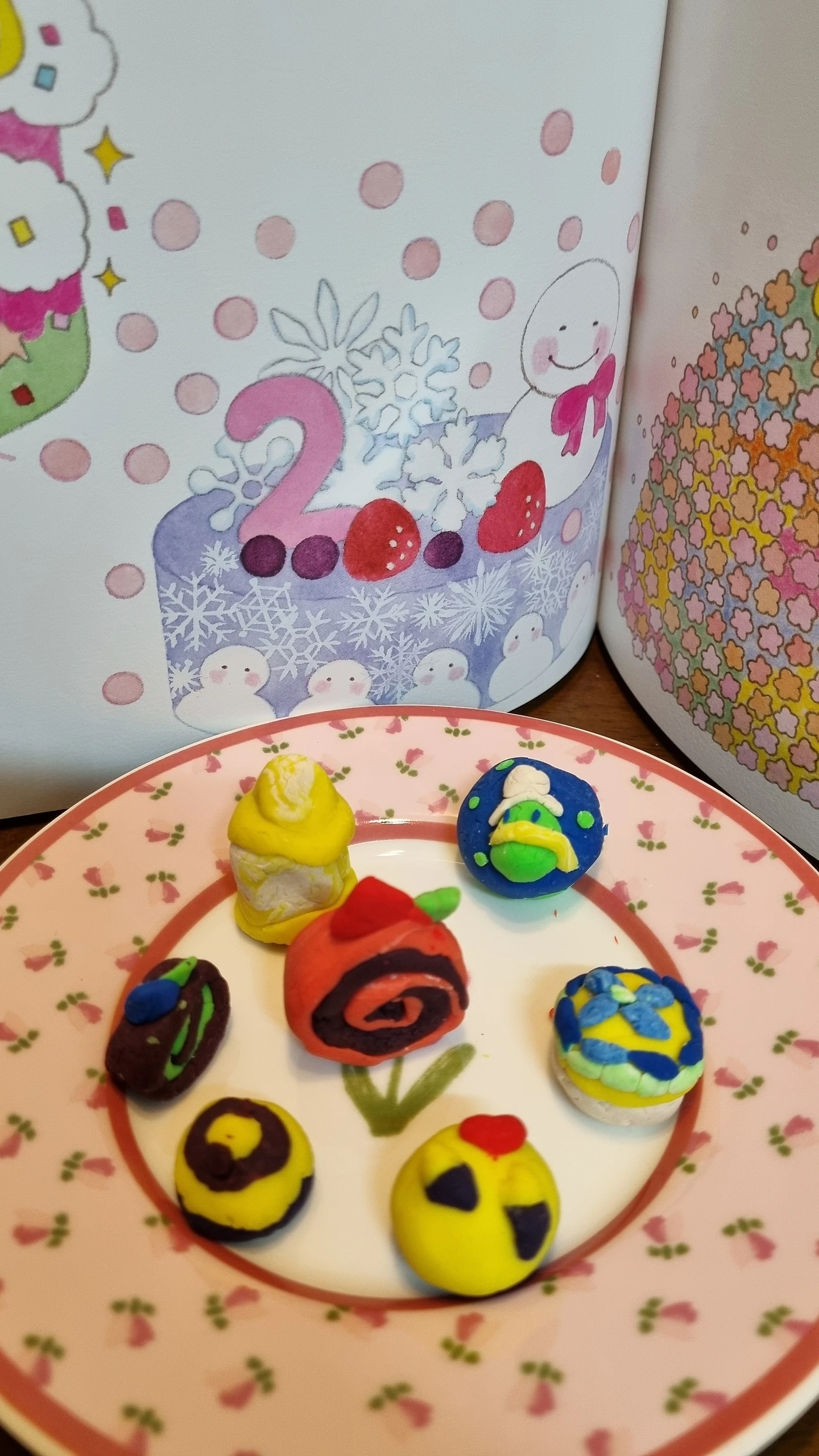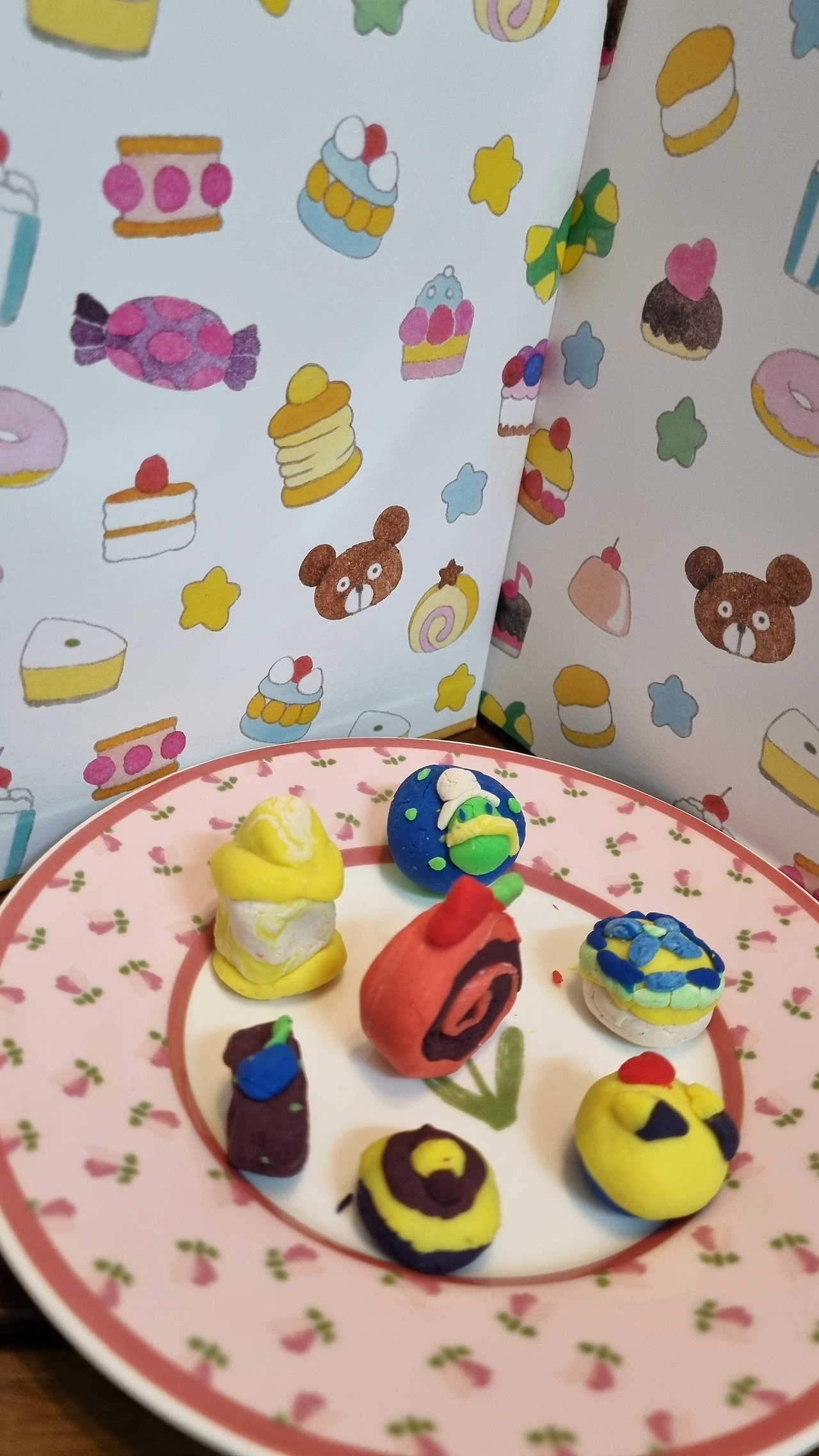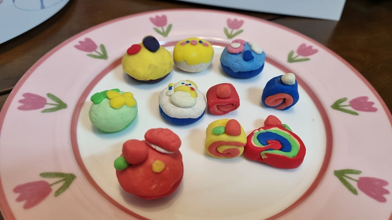 첫째 아이가 만든 케이크들도 한 접시에 담아놓았습니다. 짧은 시간에 뚝딱뚝딱 여러 개를 만들었네요.