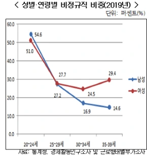 ∙ 특히 20대 여성의 비정규직의 비율은 남성과 유사하지만 30대 여성은 남성보다 확연히 높음