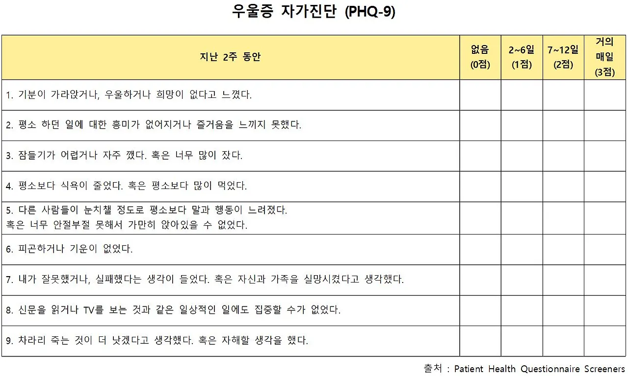 - 한 줄 요약 : 우울증과 단순 우울감을 나누는 척도는, 해당 증상이 2주 이상 지속되는지에 대한 여부다.