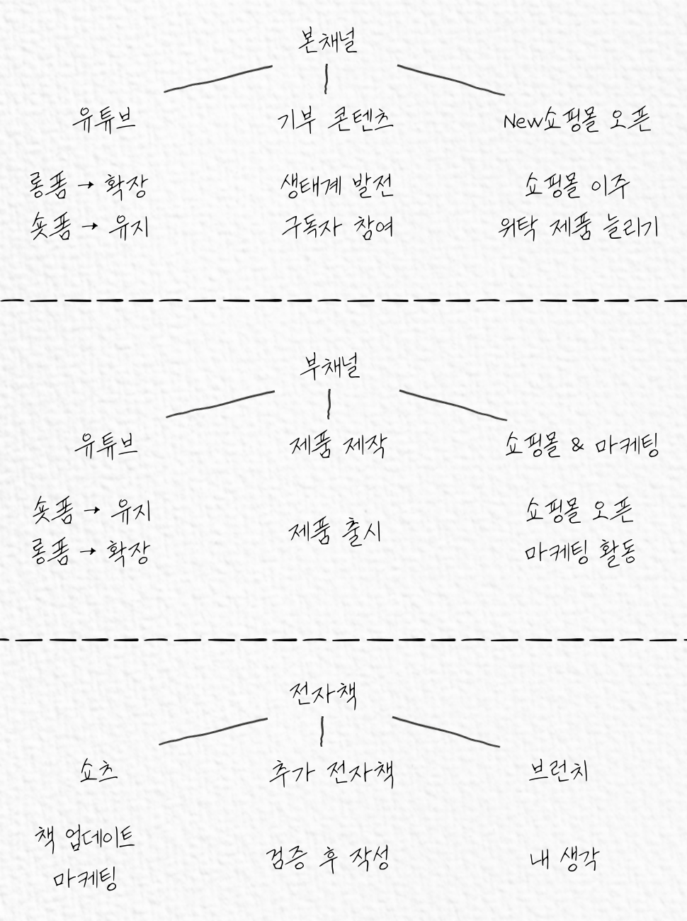 부채널의 경우, 제품 사입이나 위탁을 하는 것이 아니라 제품을 직접 제작할 계획이기 때문에 이와 연계된 콘텐츠를 어떻게 풀어나갈지 고민하고 있다. 제품 샘플 제작 단계이기 때문에 본격적인 콘텐츠 제작까지는 아직 시간이 있다. 아마 하반기부터 롱폼 영상을 제작해야 될 것 같다.