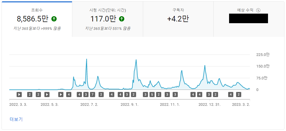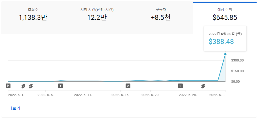 사실 5년 동안 유튜브를 하면서 알고리즘이 돌아 단발적으로 수익이 많이 나오는 달은 있었지만 이렇게 꾸준하게 수익이 올라갔던 적은 없었다. 이는 쇼츠로 폭발적인 조회수를 만들었다는 것, 이를 통해 수익 다각화를 했다는 것이 주요했다.