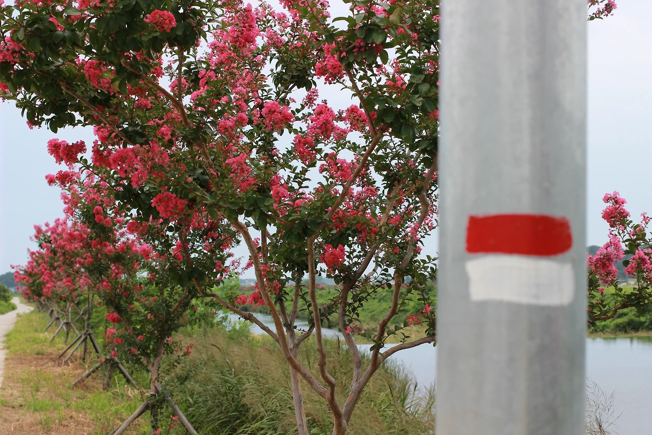 둑방길엔 모름지기 꽃이 있어야 하는 법. 사천천 둑방길이 선택한 꽃은 바로 '배롱나무꽃'. 둑방길을 따라 늘어선 배롱나무의 단정함과 배롱나무꽃의 화려함에 순식간에 마음을 빼앗기고 만다. 배롱나무는 백일 동안 꽃을 피운다고 하여 목백일홍이라고도 불리는데, 지금이 꽃이 한창 예쁘게 피어있는 시기인 것이다.