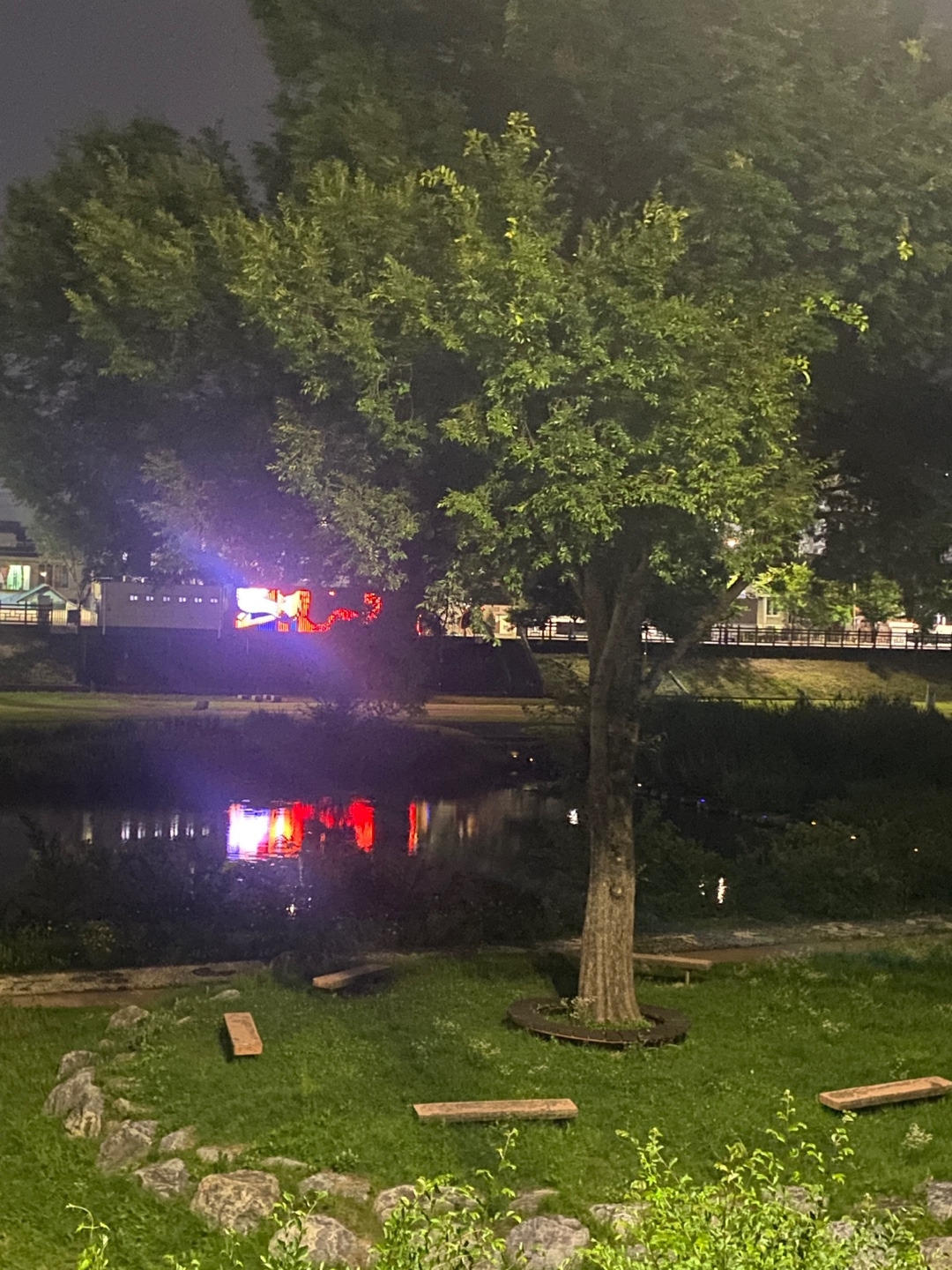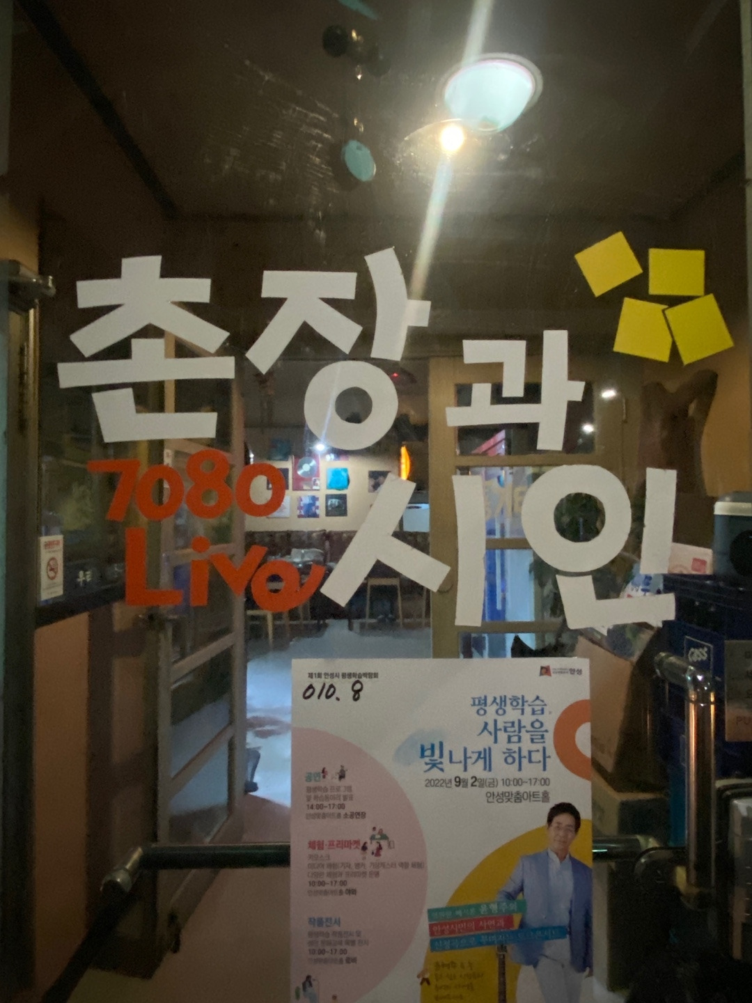 강변에 닿으면 퀴어프렌들리한 무지개다리가 있다. 나는 보통 그 다리를 건너지 않고 다리의 오른쪽길인 산책로 2-2를 택한다. 웅이는 2-1를 더 좋아하는 것 같은데 노을을 보는 날이 아니면 그 쪽 산책로는 나에게 약간 심심하다. 2-2엔 조금 더 많은 나무와 의자와 낚시꾼들이 있다. 2-2를 시작하자마자 낚시꾼들의 자전거가 줄 서 있는데 나는 이들의 찌가 흔들리는 것을 별로 본 적이 없다. 그저 유유자적하기 위해 나온 사람들. 길을 따라 걷다보면 허접하고 우스운 분수가 있고, 좋아하는 커다란 나무 3그루가 있다. 무엇보다 촌장과 시인을 지나가게 되는데 그냥 간판만 봐도 좋은 것이다.