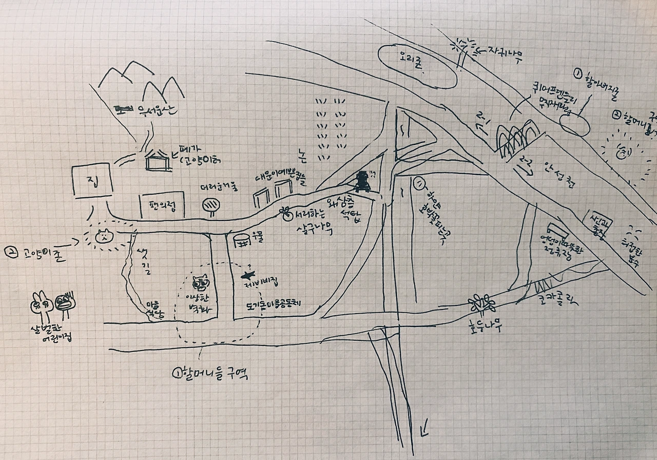 오자마자 옷을 갈아입고 이어폰을 챙겨 집을 나서면 바로 고양이 구역이 나온다. 주차장으로 이동하는 순간에도 2-3마리의 고양이들을 만날 수 있는데, 주차장 앞 폐가는 고양이들이 새로 태어나고 새로 죽는 공간이다. 여러 마리의 아기 고양이들과 하얀 고양이뼈를 볼 수 있다. 파란 트럭 아저씨가 밤마다 밥을 준다. 주차장에서 왼쪽으로 꺾자마자 보이는 편의점 앞엔 동네 고양이 ‘코’가 있다. 코는 이 동네에서 유일하게 인간을 무서워하지 않는 고양이다. 종종 그 자리를 탐하는 고양이들이 있지만 아무래도 역부족인 듯하다.