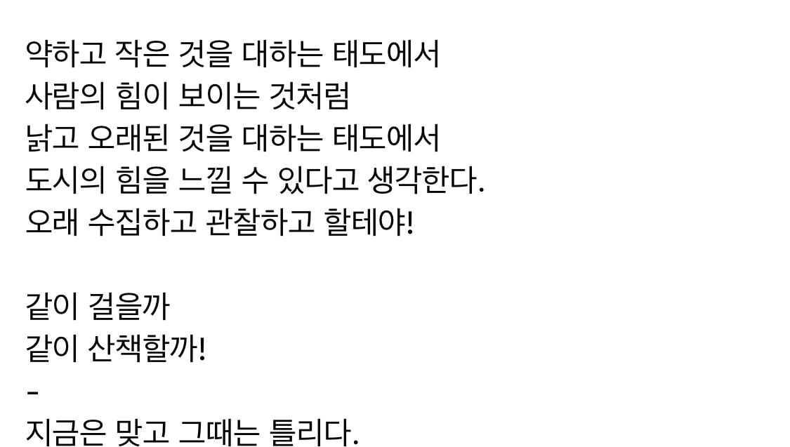 술 먹고 차를 두고 왔기 때문에 버스를 타고 출근. 그런데 버스타는 게 이렇게 재미있을 일인가. 버스 안이 원래 이렇게 예뻤나. 천안에 도착하기 전까진 안성의 시골길을 따라가는 노선이다. 2022년 가을 플리를 들으며 창 밖을 실컷 봤다. 살펴보니 내 플리는 거의 가을에 만들어졌다. 운전을 안하고 움직일 수 있으니 좋았다.