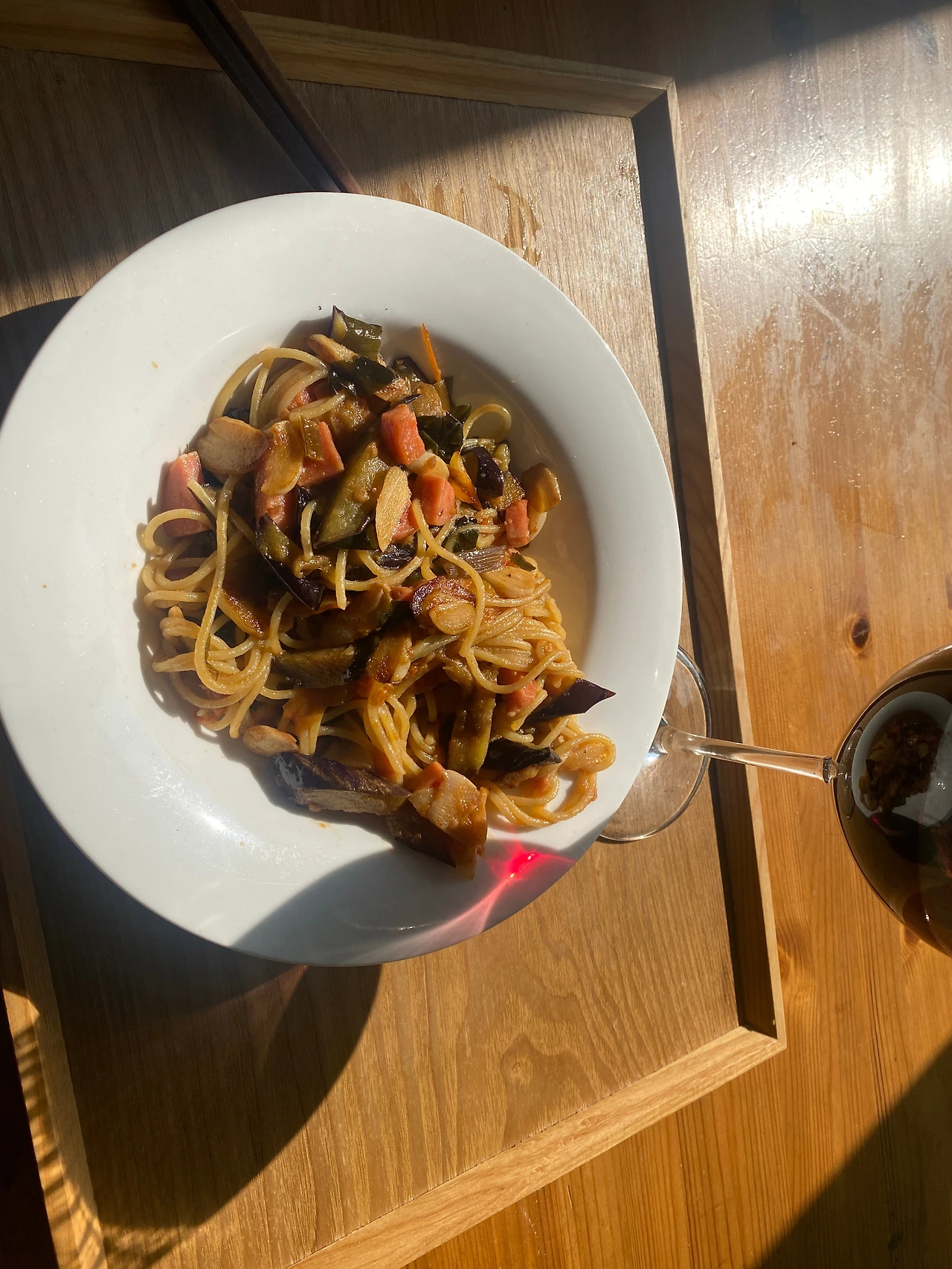 아무튼 7시에 일어나서 겨울옷을 꺼내고 빨래를 세 차례나 돌리고 대청소를 하고 났는데도 10시 30분이다. 볕에 니트를 말려두니 잘 살고 있다는 생각도 든다. 냉장고를 털어 파스타를 해 먹었다. 말라비틀어진 가지와(이게 냉장고에서 잘 말라비틀어지면 건가지가 되는데 이게 좀.. 맛있다) 3주가 지났는데도 전혀 익지 않은 토마토와 분홍 소시지와 마늘과 엄마가 준 명이나물 장아찌를 막 볶아 파스타를 만들어먹었다. 마지막에 노른자를 넣고 훅훅 저어 먹으면 내가 좋아하는 끈적한 식감이 되고 그냥 이래저래 먹을만하게 된다. 와인이 한 입정도 남았길래 같이 먹었다. 그래도 11시 30분...