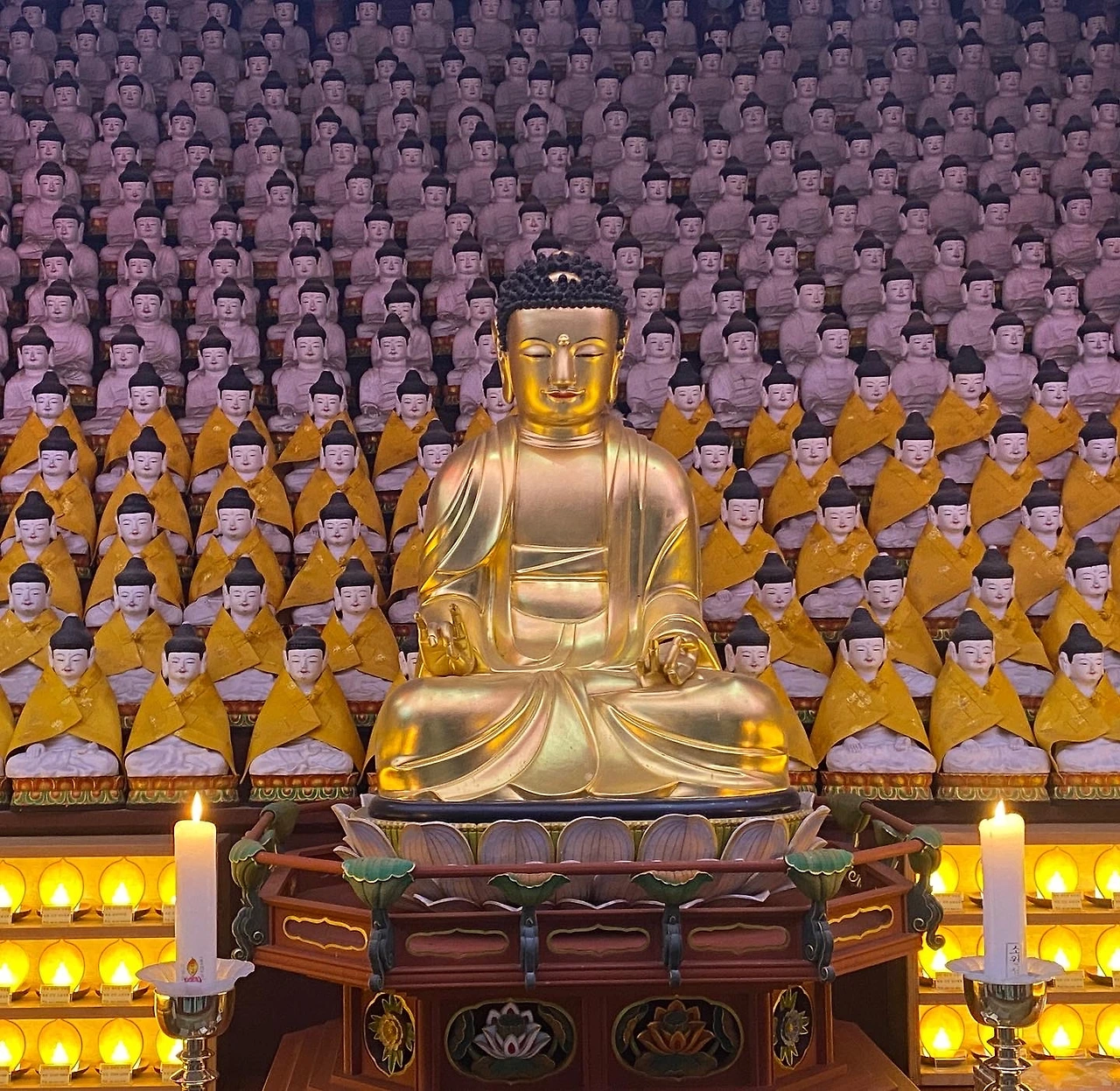 표지판에 나와 궁금했던 모과나무 기둥이 있는 구층암을 올라가는 길 자체가 환상적이었다. 웅장한 고요에서 벗어나 소박한 정원을 지나 방금 전 비로 젖어버린 대나무 숲길을 걷는 일이란. 미니단풍 잎새와 대나무 사이로 내리는 해와 바람의 해장. 구층앞 근처에는 에에올을 연상할만한 법당이 있었고 짧은 기도를 드리고 법당 뒷쪽을 둘러보는데 갑자기 커다란 적막에 삼켜지는 것 같았다. 방금까지의 들뜨고 설레는 마음이 일순간에 사라지고 섬 위에 서 있는 기분이었다. 고독하고 편편한 마음으로 길을 내려오는데 절에 있는 많은 사람들이 동시에 사라진 것 같은 느낌이 들었다. 가끔 가만히 눈을 감고 있거나 명상을 할 때 바위같은 검은 존재 외에 모든 것이 사라진듯한 느낌을 받곤 했는데 마치 그런 느낌이었다. 기도하라고 준비된 시간 같아 커다란 불상들 앞에서 평안을 기도했다. 내가 어찌할 수 없는 평안. 그러니 당신의 몫일 평안. 그것들을 동시에 기도하게 해달라고. 바라게 해달라고. 우리가 이 여행을 평안하게 마칠 수 있게 도와달라고.
