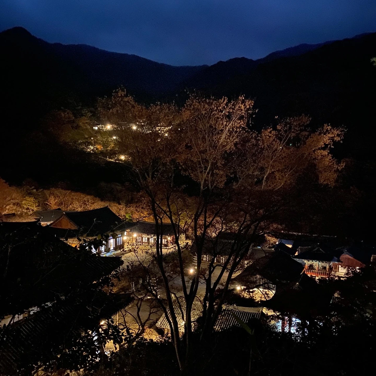 그날 밤엔 이제 모든 근사하단 말 앞에 서있을 수 있는 가장 근사한 공간에 갔다. 볕이 막 저물 때쯤 '샘이 숨어있는 절'이라는 뜻에 천은사에 들렀다. 바다같이 반짝 거리는 못이 숨어있는 절이었다. 고즈넉하고 아름다웠다. 와 무지무지 너무 좋다.. 하며 화엄사로 넘어갔는데 입구의 조명부터 마음이 설렜다. 법고라는 말은 가혜를 통해 처음 들었고, 커다란 북과 북치는 스님을 보고 싶어 찾은 곳이었다. 역시나 타이밍을 잘 맞춘 덕에 사람이 거의 없는 시간에 도착했다. 뭐든지 큰 절이었는데 그 균형들이 너무 잘 맞아서 놀라웠다. 어떤 웅장하고 거대한 것들을 보면 기가 눌리면서 약간의 불쾌한 감각같은 것들을 느낄 때가 있는데, 오히려 지리산 자락의 넉넉한 풍경과 어우러지면서 절로 존경심을 품게 했달까. 작아지면서 차분해지는 느낌.