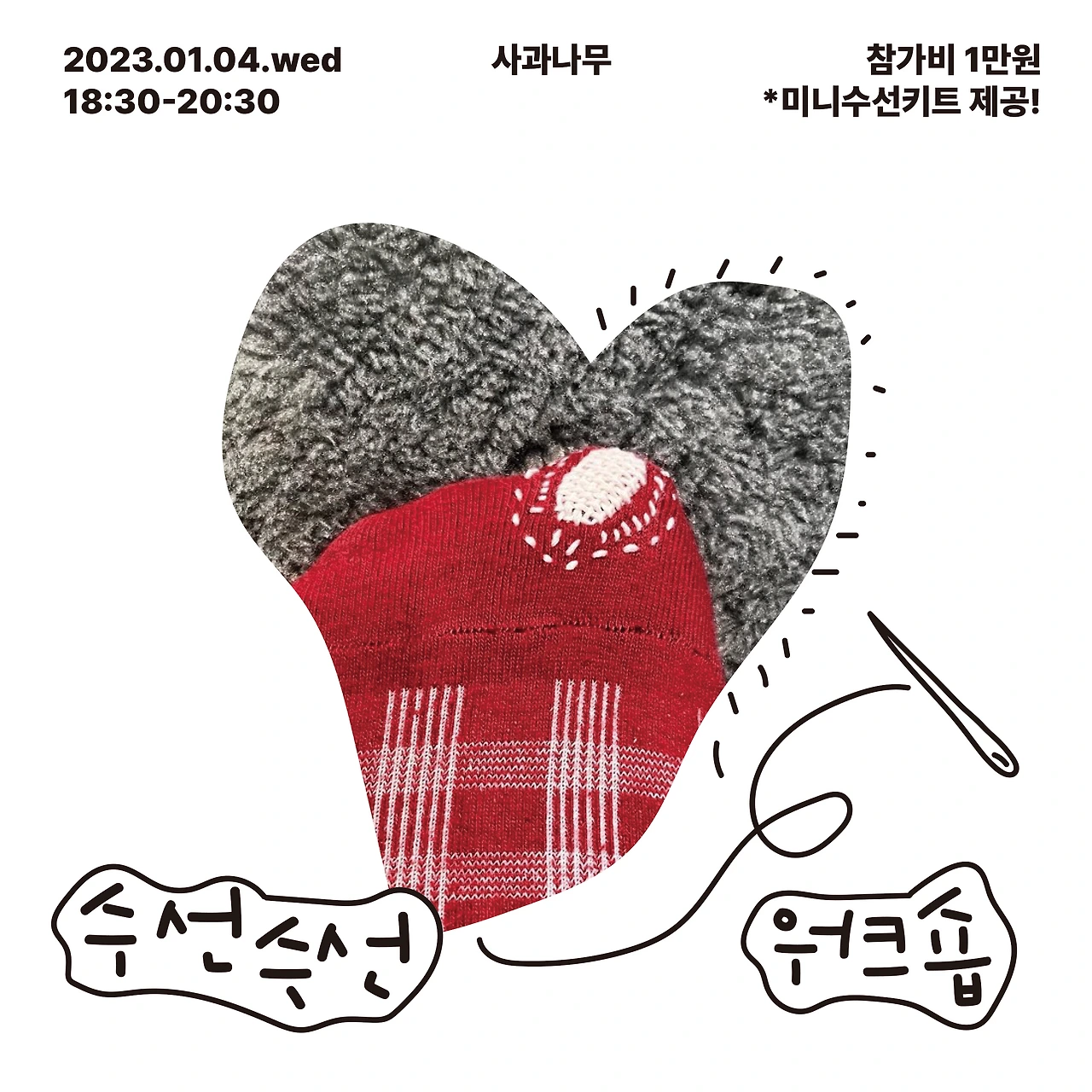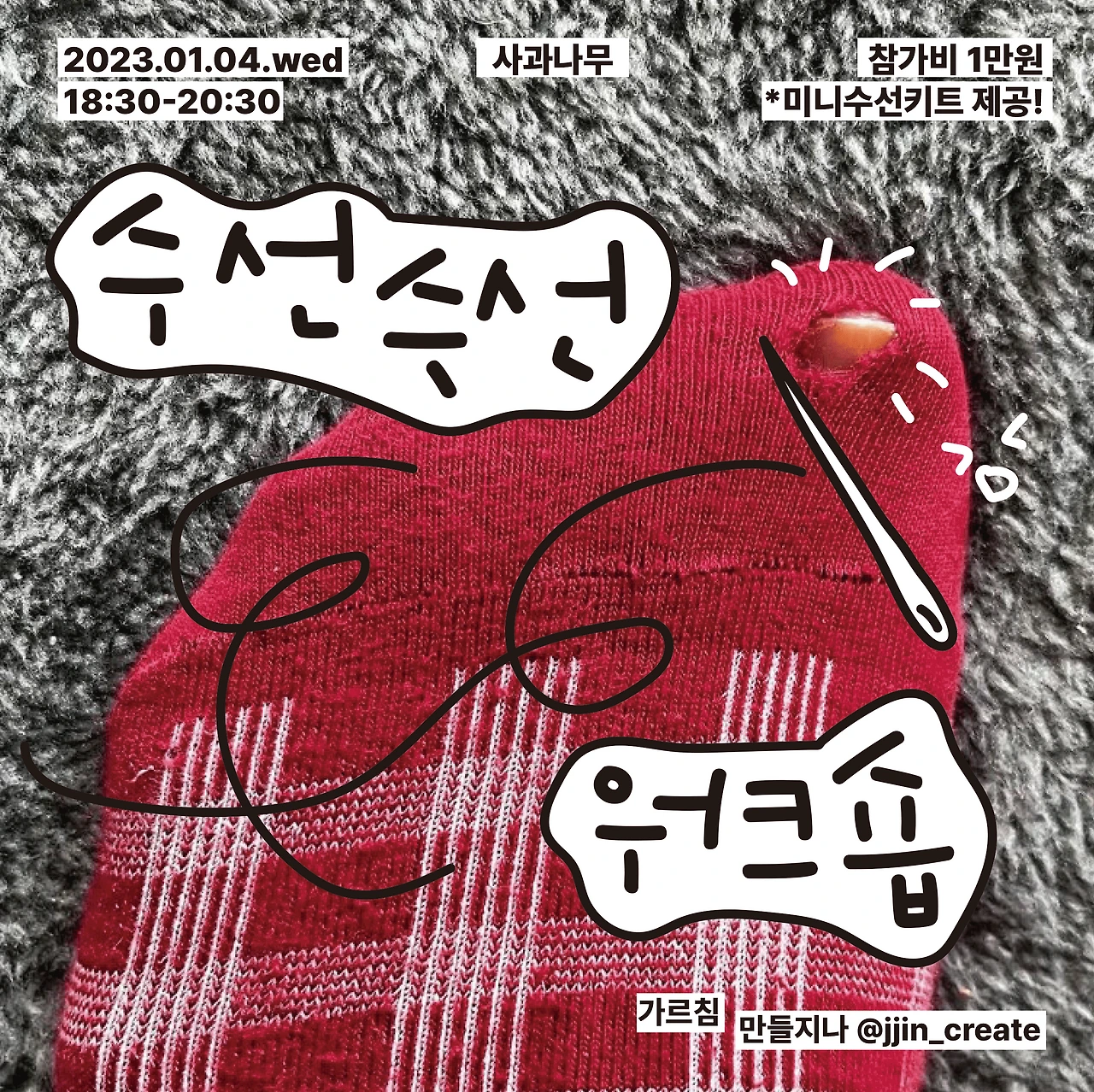 새로운 물건을 사는 일도 너무 좋아하지만, 헌 것을 사는 것을 더 좋아한다. 헌 물건을 계속 고치고 살 수 있으면 더 좋겠다. 그러다가 새 물건을 사지 않는 날이 오는 것이 언젠간 도래할 꿈.. 같은 것이다. 아무튼 아끼는 양말, 옷, 가방엔 구멍이 뿅뿅 나있는 것들이 많이 있다. 구멍난 채로 그냥저냥 잘 입고 다니지만, 진하랑 수선워크숍을 하면 멋진 무늬들이 탄생하겠지! 헌 것을 돌보는 새마음으로. 지난 시간을 수선하는 마음으로 한 해를 출발하고 싶은 사람들 모여라!