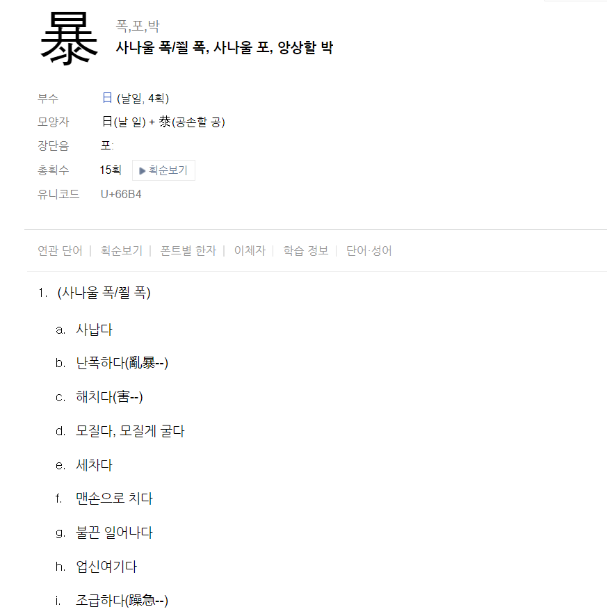 사납고, 해치고, 모질다는 뜻이군. '폭력'할 때의 '폭'자가 되겠다.