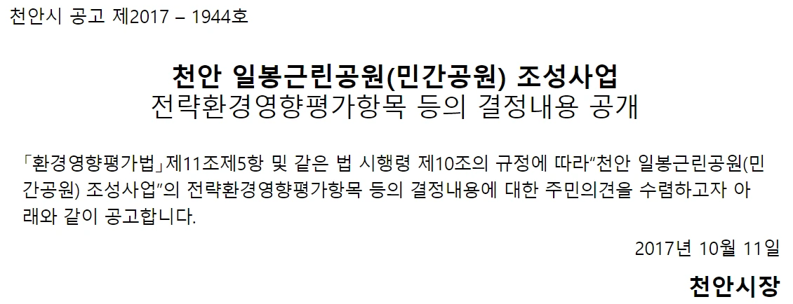 천안시의 경우는 일봉, 노태, 청수, 백석공원이 대표적인 해제지역이에요. (이 글에서는 일봉산의 문제만 다루어볼게요.) 천안시는 도시공원일몰제에 대응하기 위한 방법으로 민간공원조성특례사업을 선택했어요.
