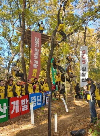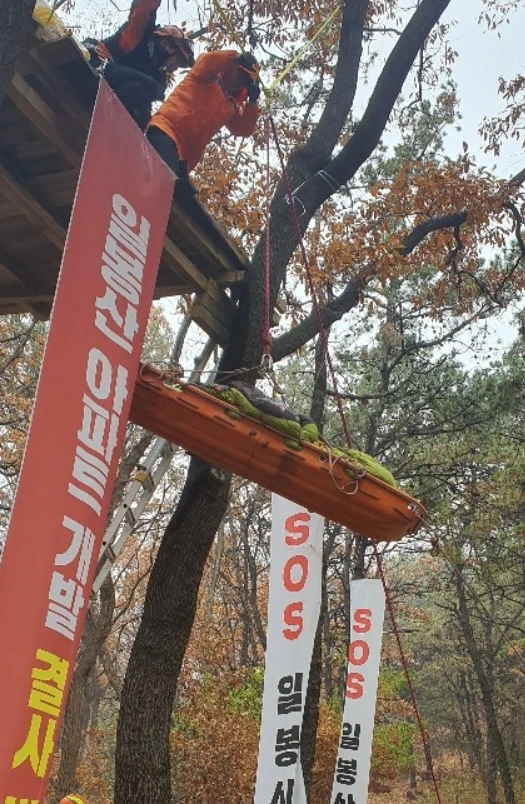 일봉산대책위 활동가는 고공농성과 함께 단식을 이어나가다가 건강악화로 병원에 이송되기도 하고요.