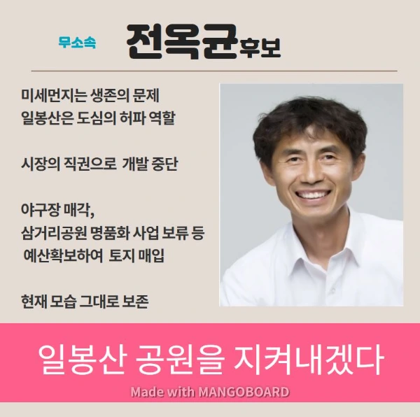 결국 일봉산 주민들의 의견을 수렴하겠다고 밝힌 박상돈(자한당)후보가 시장에 당선되었어요. (아마 어떤활동가들은... 일봉산을 지키기 위해 보수세력을 뽑아야하는 생애최초의 선택을 했을지도요. )