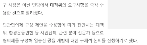 그러니까! 그 시민들의 삶과 아주 밀접했던 동네뒷산을 개발하는데, 주민들의 의견을 전혀 수렴하지 않거나. 혹은 거짓말하면서 민간개발을 위한 절차를 밟아나갔다는 것!