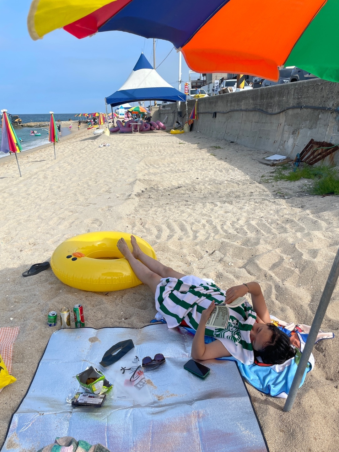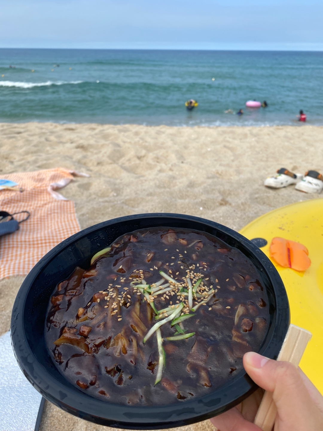 사장님과 객식구, 게스트는 마중으로 떠나고 시내랑 둘이 물놀이를 했다. 동해는 파도가 많아서 튜브만 타고 있어도 재밌다. 서핑을 하고 싶었다. 출출해져서 바다에서 짜장면을 시켜먹었다. 맛보다는 해변 앞에서 먹는 짜장면의 무드가 좋았다.