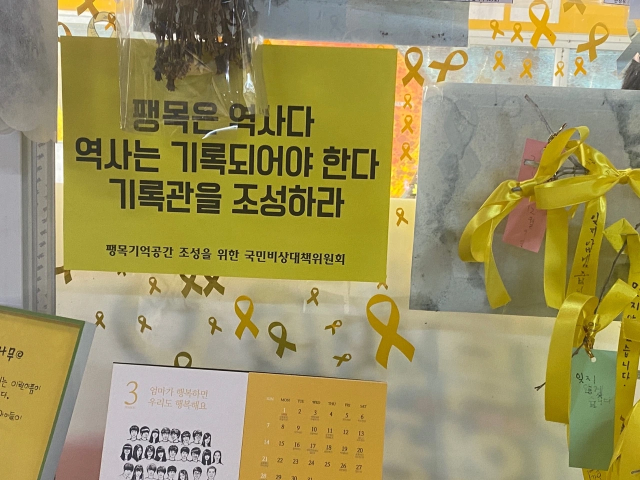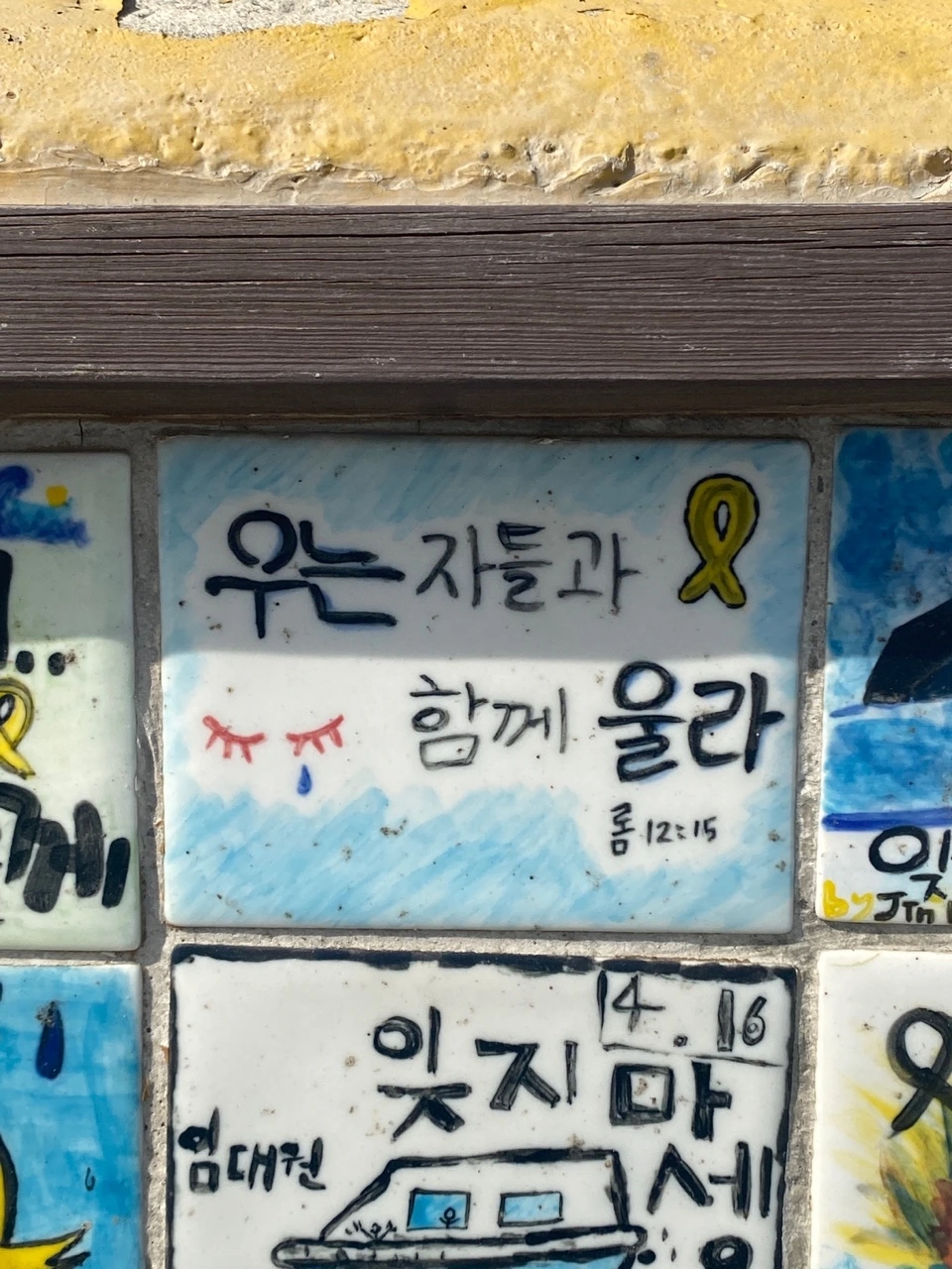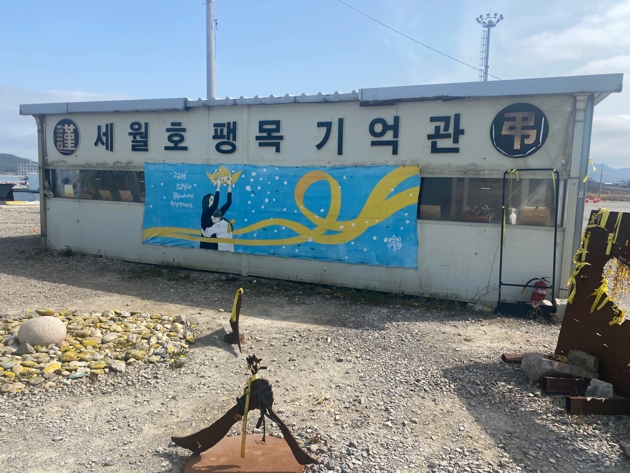 4시간 넘게 걸려 진도에 도착했다. 시간이 부족해 김밥을 몇 줄 사서 먹고 팽목항으로 갔다. 도착한 순간 그 허전함에 할 말을 잃었다. 304명이 죽어나간 참사의 현장은 방치되어있었다. 세월호기억관이라는 옹색한 간판이 달린 컨테이너 박스가 추모할 수 있는 공간의 전부였다. 활동가나 가족들이 곳곳에 채운 전시물들이 있었지만 기억관의 구색을 갖추기엔 너무나도 초라했다. 몇몇 조형물들과 등대로 가는 길의 타일들, 낡아가는 노란 리본들이 전국에서 보내온 현수막들이 그나마 이곳이 한 때 슬픔과 추모로 가득 찬 현장이라는 것을 알게 했다.
