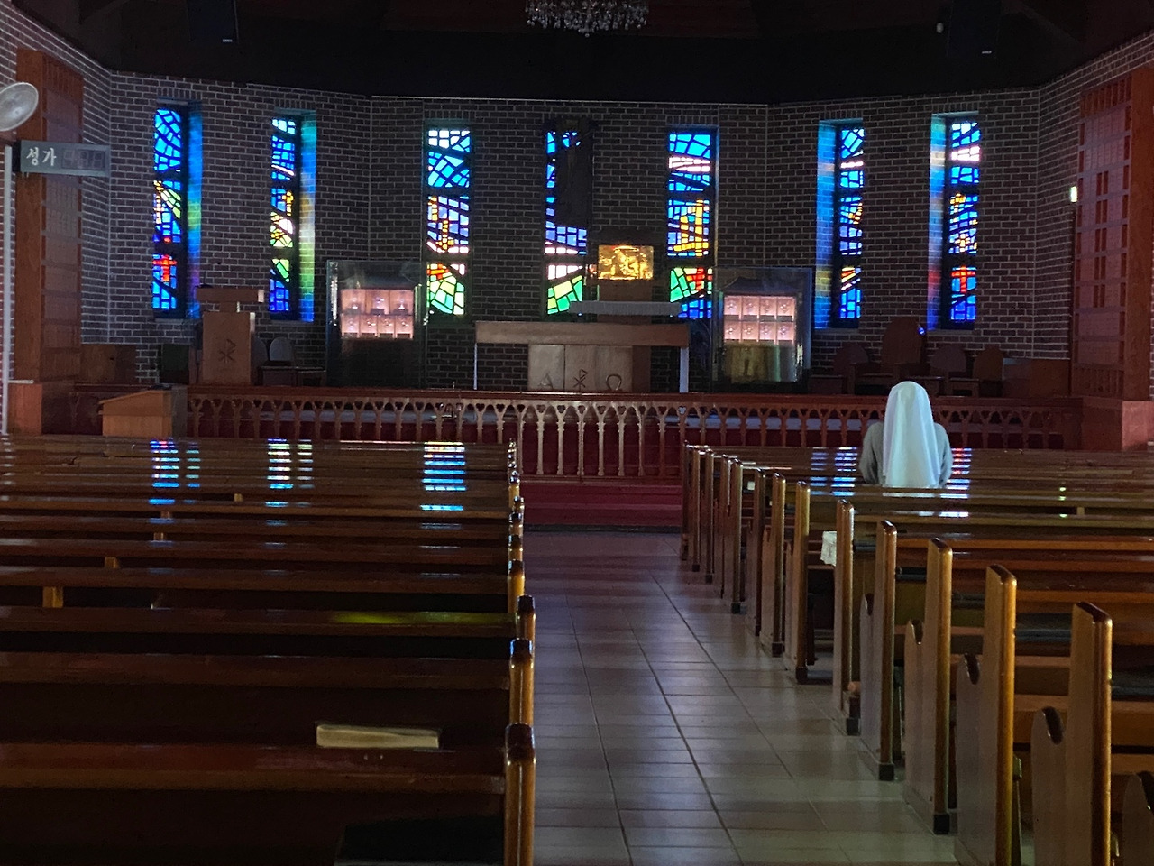 사장님을 보내고 용주샘과 약현성당에 갔다. 찬찬히 올라가는 작은 공원도 좋았고 성당 외부도 너무 아름다와.. 아쉽게도 내부를 볼 수 없었다. 지나가는 수녀님께 여쭈어보니 내부는 지금 들어가라 수 없고 대신 뒷 켠에 들어갈 수 있는 공간이 있다고 하셨다. 들어가니 어둠 속에 형형색색의 스테인드글라스 창문들에서 빛이 내리고 있었다. 단숨에, 정말 단숨에 이 공간을 사랑하게 되었다. 마음이 시끄럽게 돌아다닐 때마다 찾아오고 싶은 공간.