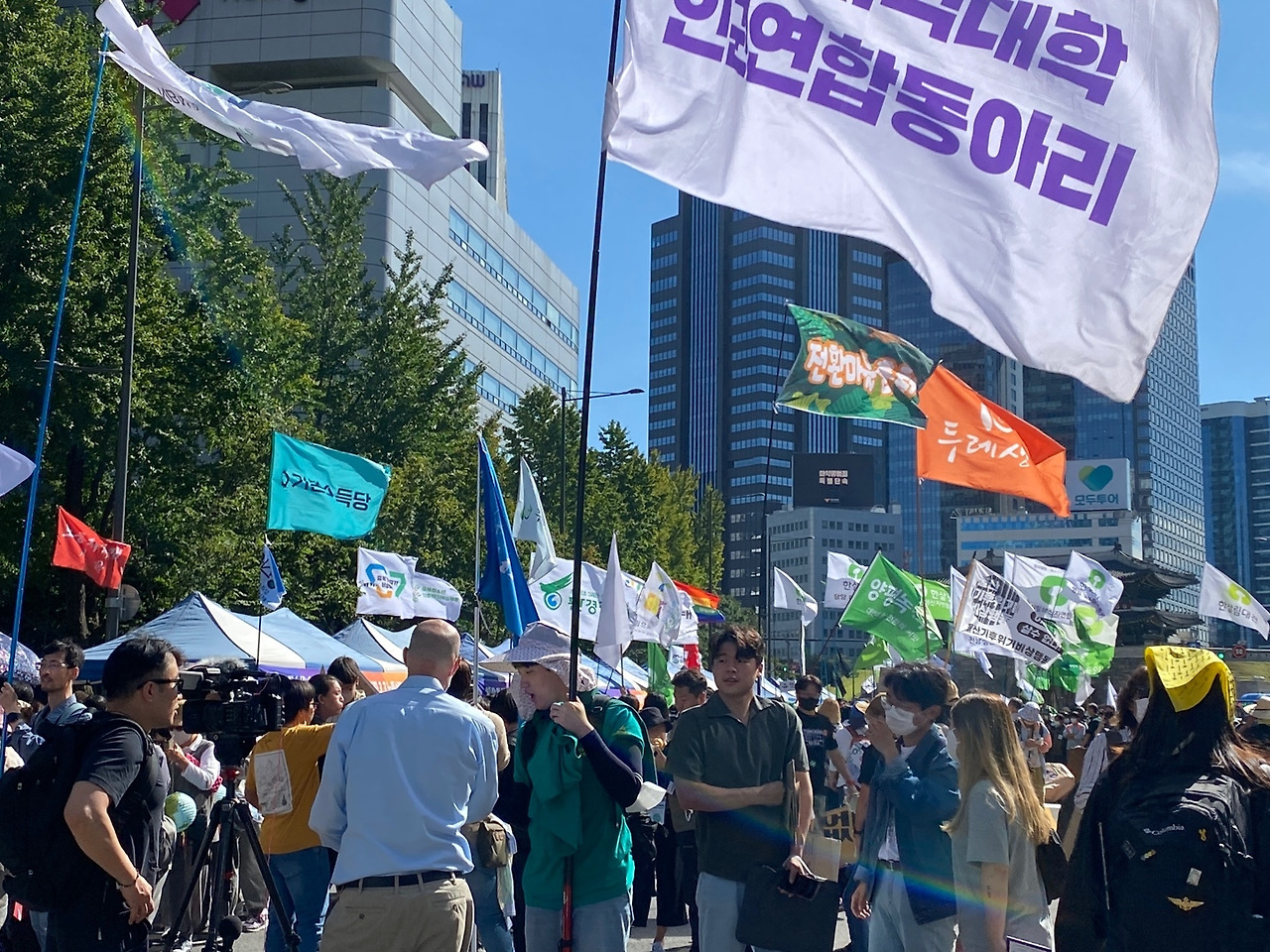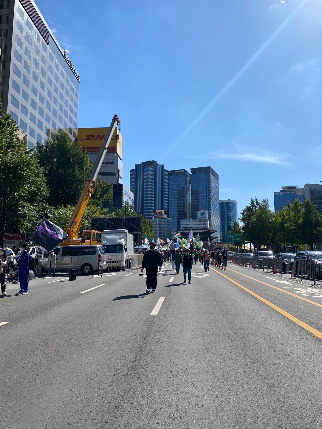 차도를 걸을 수 있는, 집회가 좋다. 곳곳에 피켓들을 준비한 사람들, 한껏 꾸린 집회 용사들이 있었다. 이런 곳에 오면 내 인생... 너무 평범하다고 느껴진다. 좀 더 전투적으로 살아야하나.... 기후는 위기라는데 사람들은 조금 신이나 보였다. 다들 집회를 기다려온 사람들처럼 모여들었다. 반가운 얼굴들을 많이 만날 수 있었다!