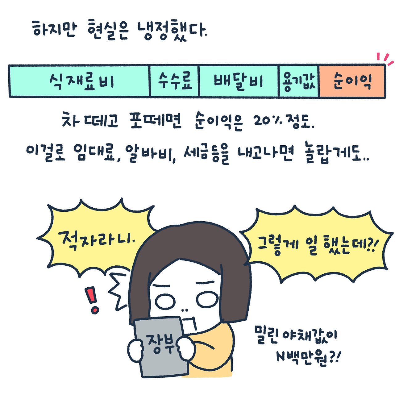 하지만 배달 앱 수수료, 배달비, 포장 용기 등의 비율이 생각했던 것보다 높았다. 그야말로 차 떼고 포 떼면 남는 게 없었다.