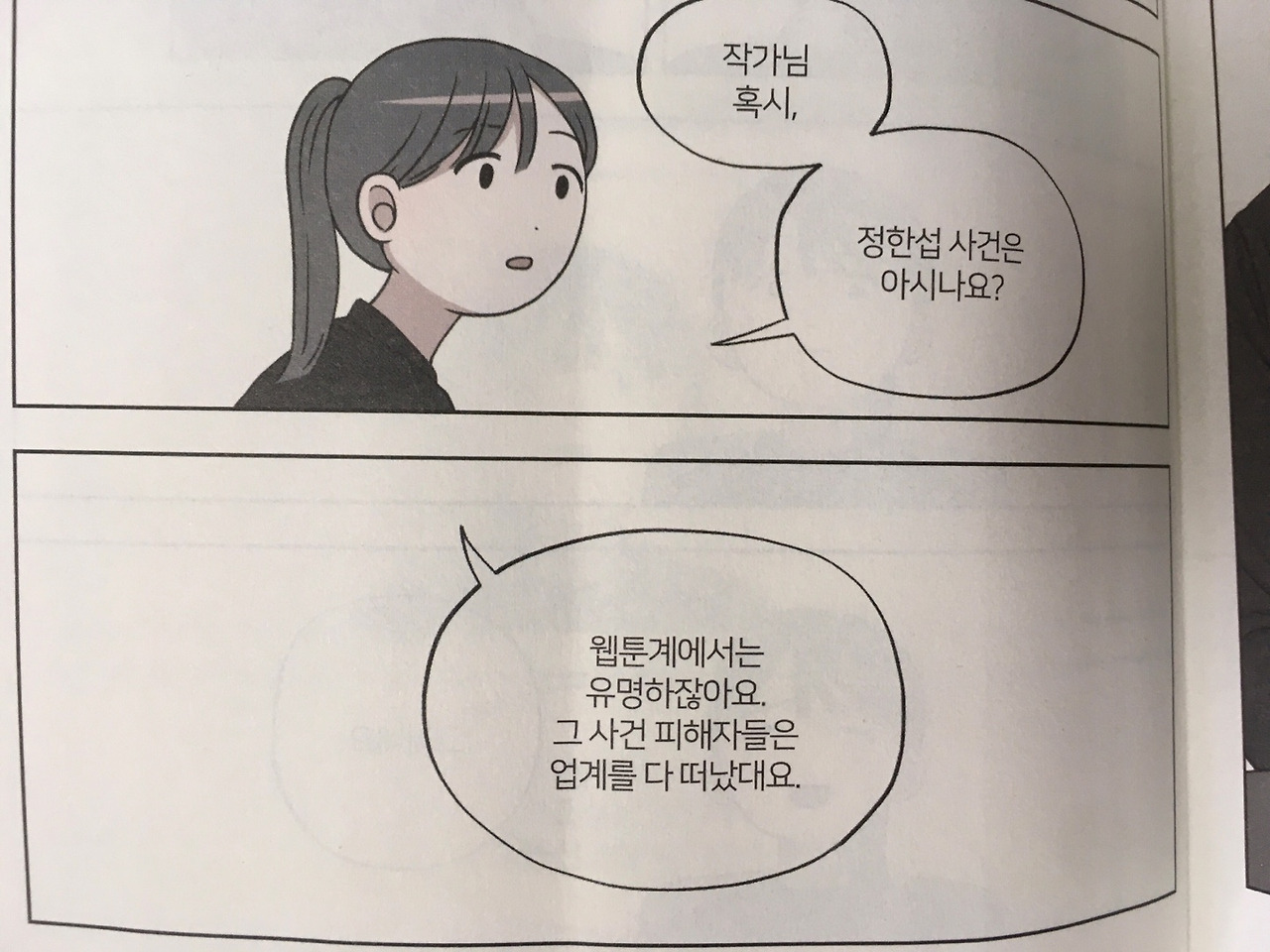 작가님 혹시, 정한섭 사건은 아시나요? 웹툰계에서는 유명하잖아요. 그 사건 피해자들은 업계를 다 떠났대요.