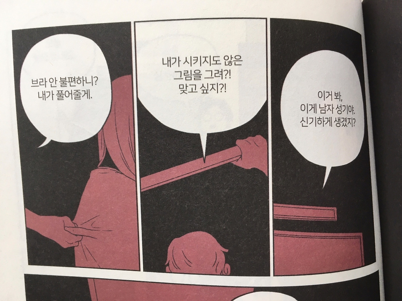 심각한 주제를 다루고 있음에도 불구하고 작품의 동그란 그림체 덕분에 독자로서 사건과 좀 거리를 둔 채 덜 힘들게—하지만 안 힘들었다고 말은 못 하겠다—감상할 수 있었다. 가족과 직장에서 권력자들이 그리고 권력에 기생하는 사람들이 뚫린 입이라고 내뱉는 말인지 배설인지 싶은 것들의 버라이어티함이 빡침 게이지를 한껏 높인다.