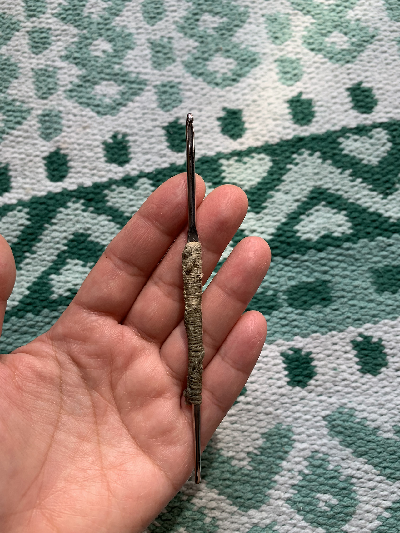 그렇게 수없이 많은 코바늘을 사 오므고 써보았지만 결국 할머니가 쓰시던 코바늘 5호가 어쩐지 제일 딱인 느낌이다. 처음부터 그랬던 건 아니다. 면끈을 손잡이가 아플까 봐 감아놓은 이 허름한 코바늘이 이상해서 쫑쫑 감아놓은 실에 칼집을 내어 벗기려 했는데 실이 돌아가기만 하지 영 벗겨지지 않았다. 그래서 포기하고 쓰다보니 웬 걸 편하다 감겨진 실이 쥔 손이 뜨면서 미끄러지는 것을 잘 잡아주고 있다.