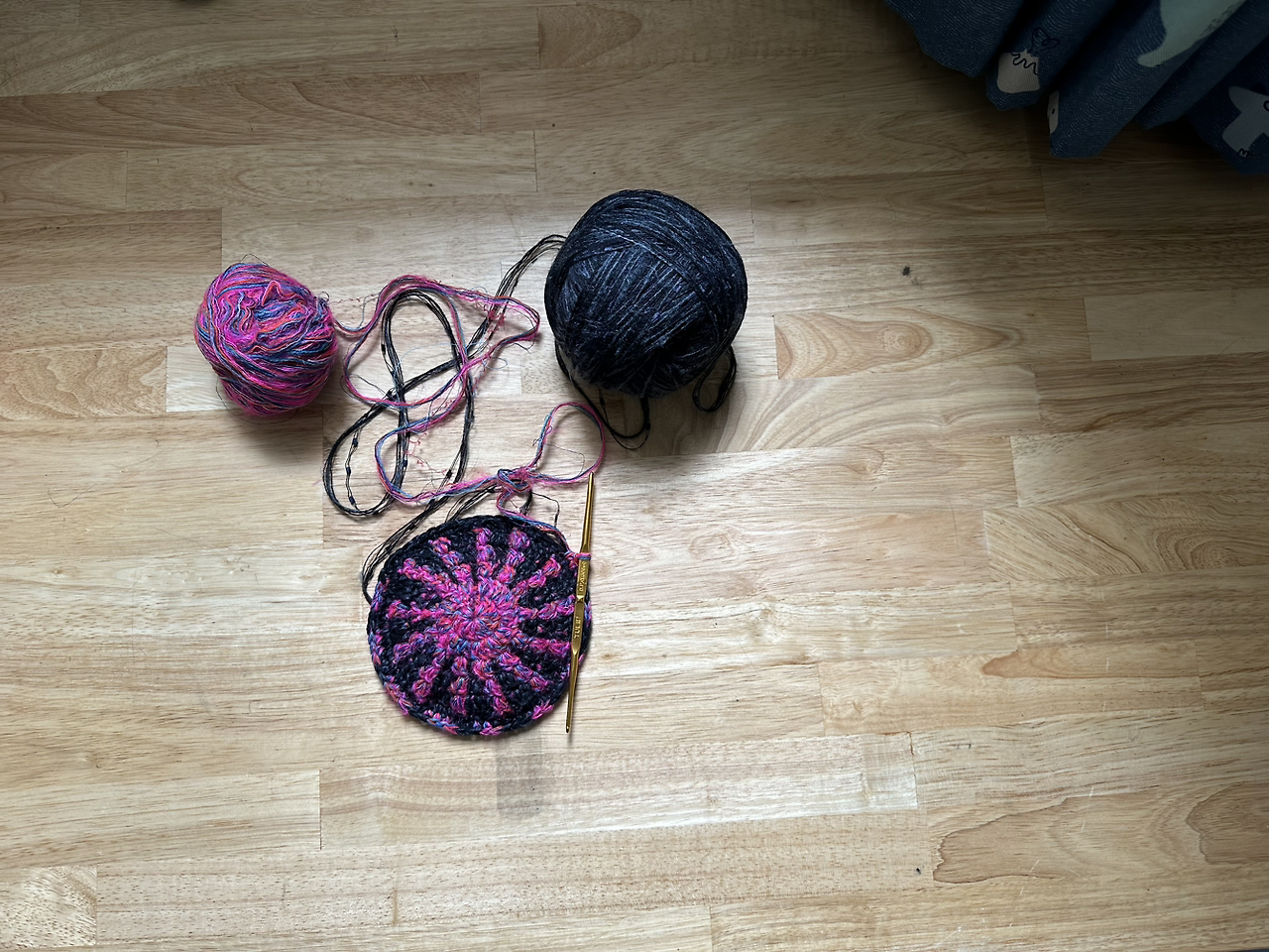 나는 뜨개질을 하면서 처음부터 그게 어떤 가방으로 할지 계획하지 않는 편이다. 지금까지 뜨개질 책에서 보았던 도안들을 머릿속에 기억하고 있고, 그 도안과 어울리는 색깔을 본능적으로 집어서 두 가지의 색을 섞으며 실을 뜨면 동그라미를 만든다.
