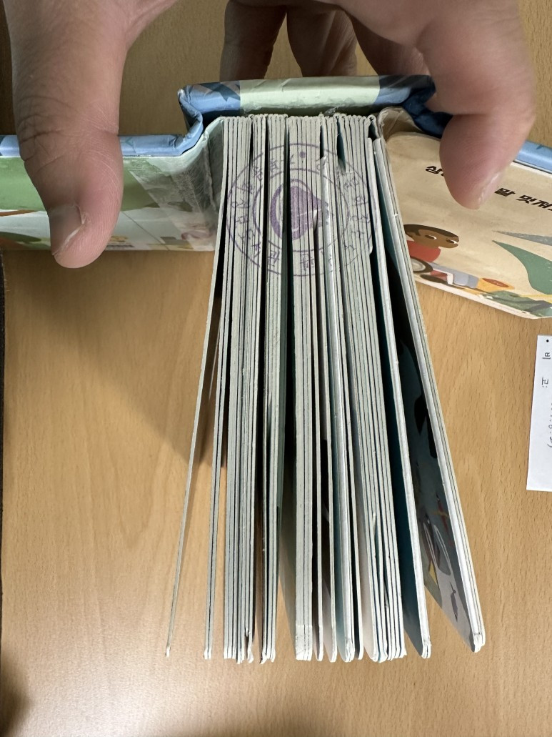 이번 책은 단단한 보드지로 만들어진 유아책이어서, 책등을 단단하게 고정했었다. 그러나 몇 주가 지나서 북프레스기에 고정한 책등을 떼어보니, 책등을 펴자마자 쩍 하고 갈라졌다. 책등을 붙이지 말고 작업하라는 선생님의 말씀이 맞았다. 책등은 붙었다 떨어졌지만 책을 읽는 데는 큰 지장이 없고. 면지가 떨어진 것은 수리했으니 다시 서고로 보냈다.