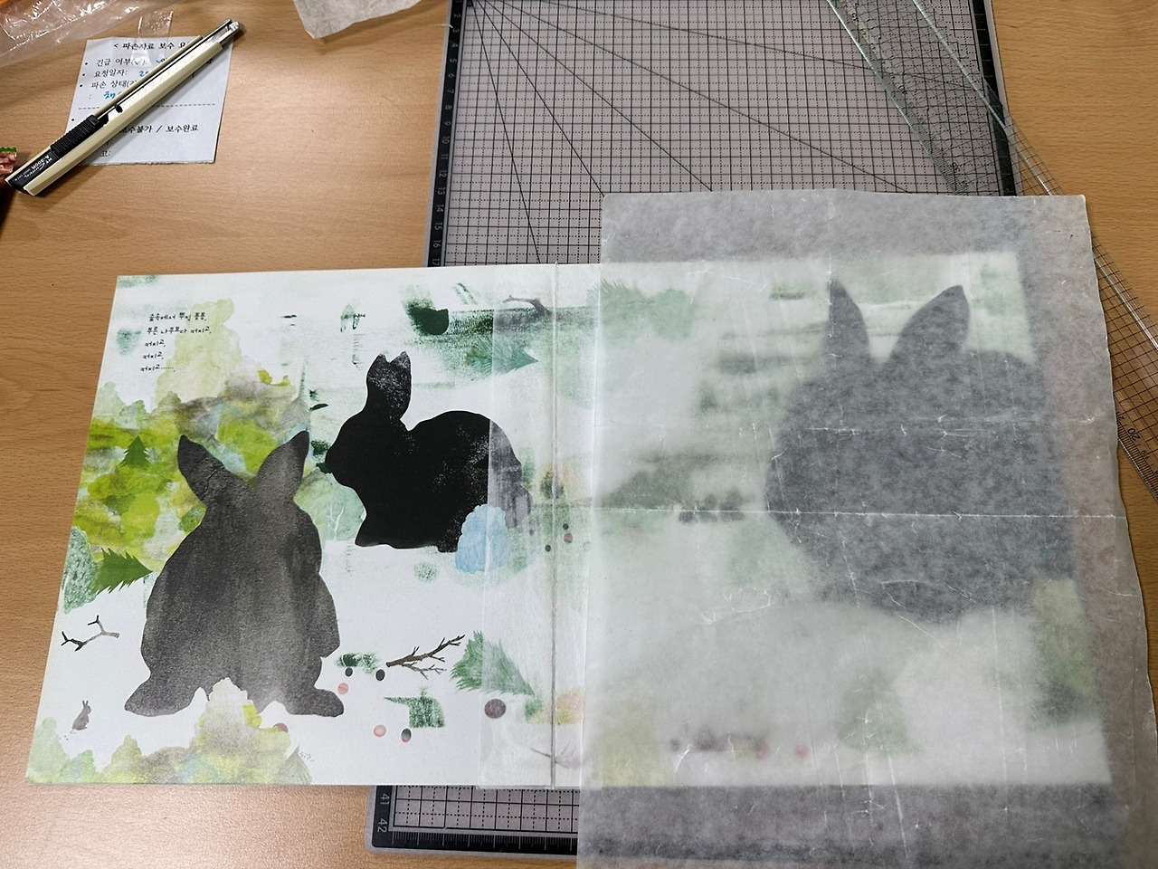 왁스페이퍼를 대고 제본풀을 바르고 붙인 책을 본폴더로 쓱쓱 밀어주기도 하고, 왁스페이퍼 위에 풀칠할 종이를 올리고 붙이기도 한다. 제본풀이 새어 나와서 책이 젖지 않게 할 때도 그 사이에 껴두기도 한다. 참 기능도 쓸모도 많아서 점점 애정이 생긴다.