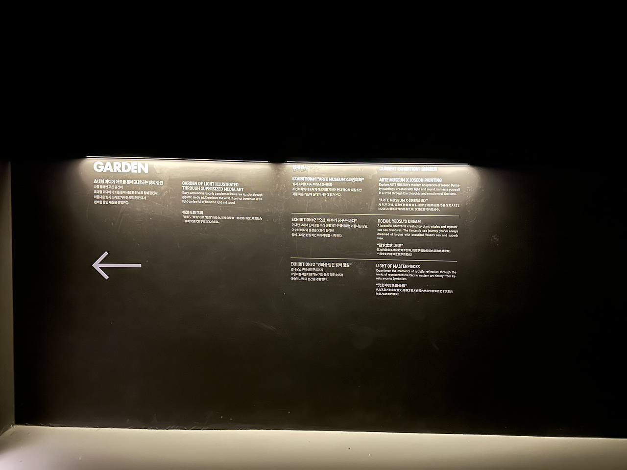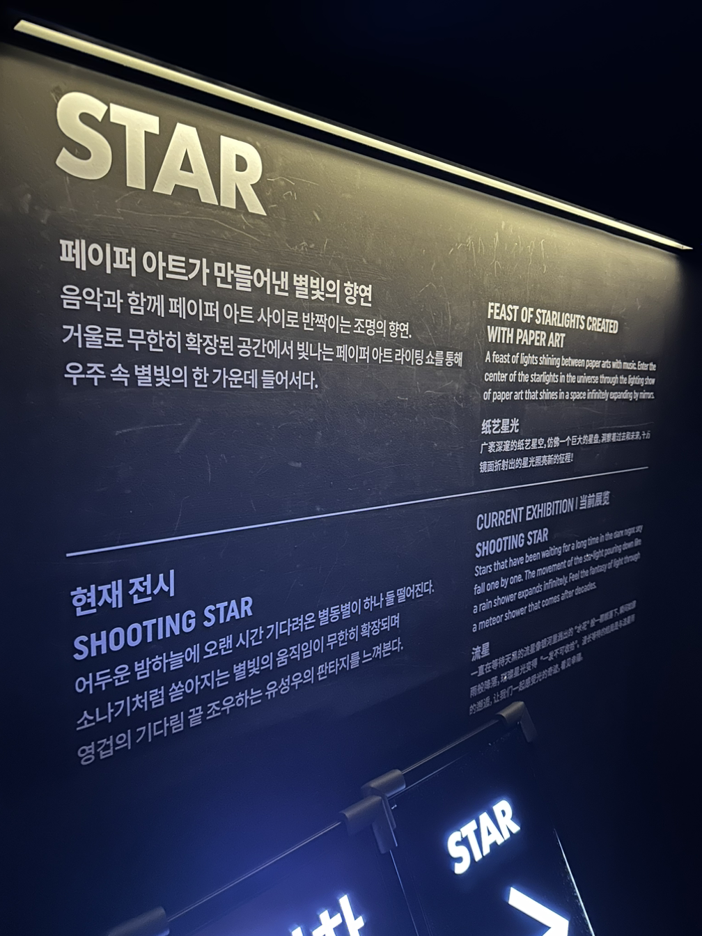 전시공간을 위한 화살표는 반짝이며 암전 된 공간에서 관람객이 길을 잃지 않게 알려주고 있다. 동선과 흐름이 물 흐르듯 자연스러웠다.