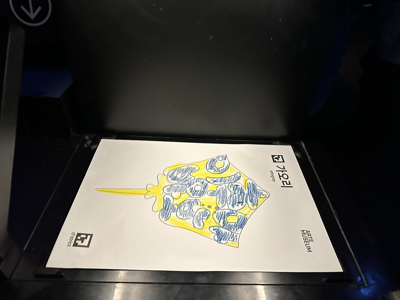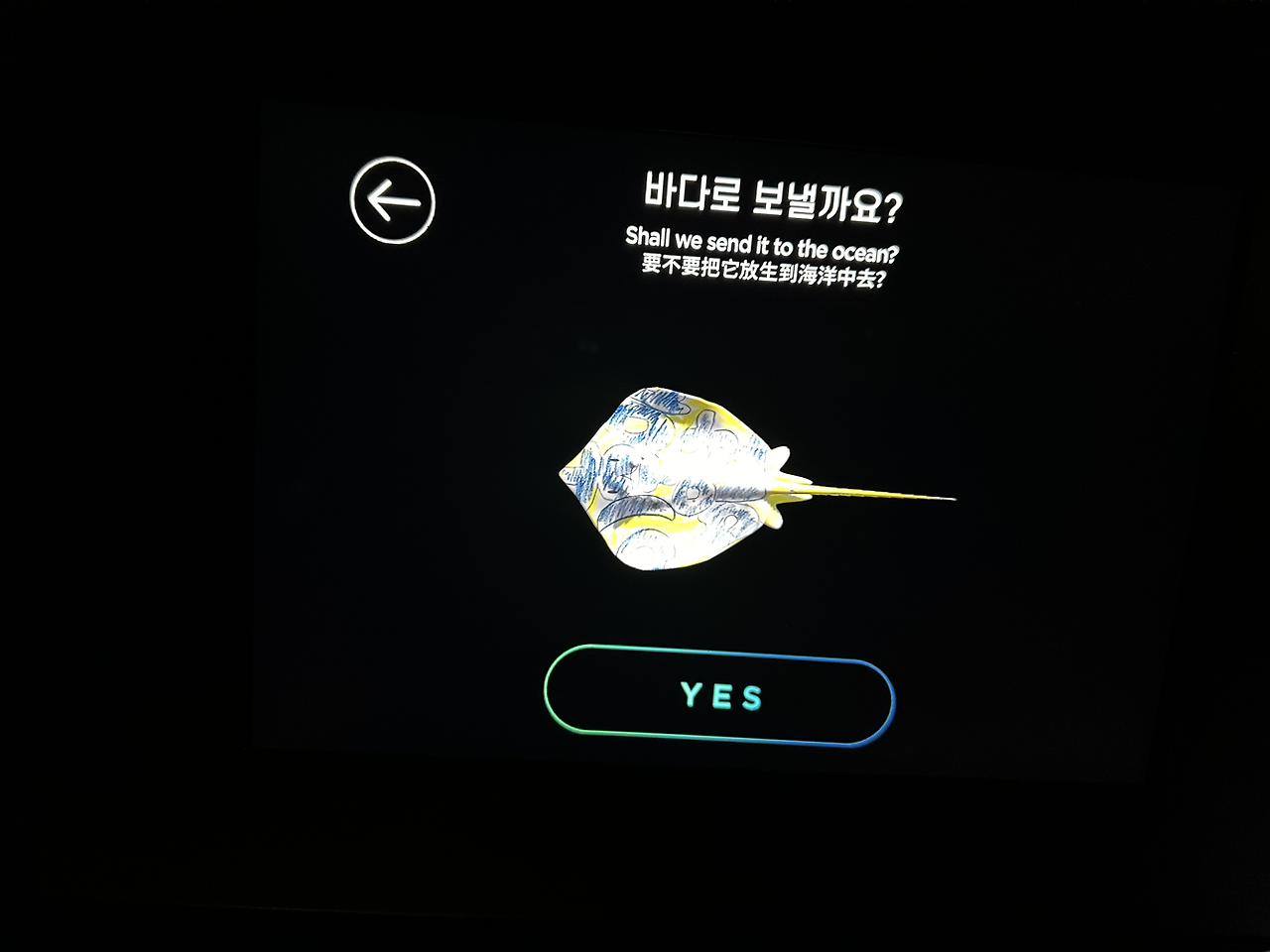 아이가 그린 종이에 그림을 그린 후, 스캔하면 영상 안으로 들어가서 움직이는 가오리가 된다.