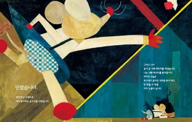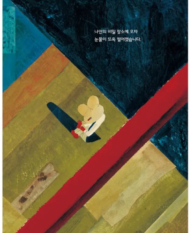 눈물빵 책의 주인공은 교실에서 자신만 수업내용을 알아듣지 못한다. 모든 친구들이 손을 들고 발표를 기다리고 있는데, 혼자만 소외감을 느낀다. 이 아이는 혼자만의 공간에 와서 자신이 좋아하는 손수건으로 눈물을 닦는다. 그리고 지붕 틈으로 손수건을 던져 버린다. 분에 차서. 붉고 강렬한 선은, 뜨거운 주인공의 감정을 그대로 전달해 준다. 서럽고 괴롭고 외롭고. 눈물을 흘릴 정도로 강렬하고 서운한 사정은 어디서 나오는 걸까.