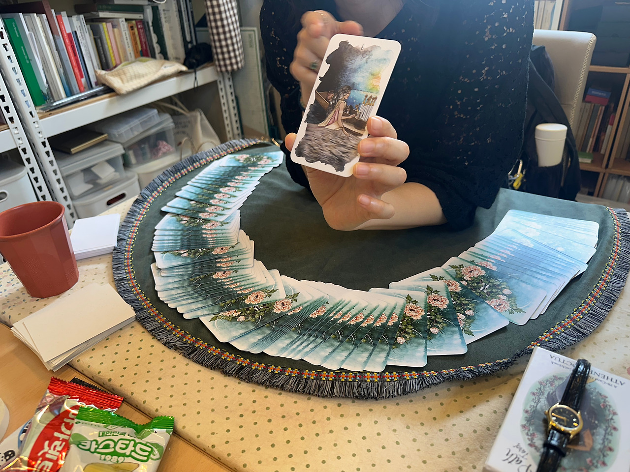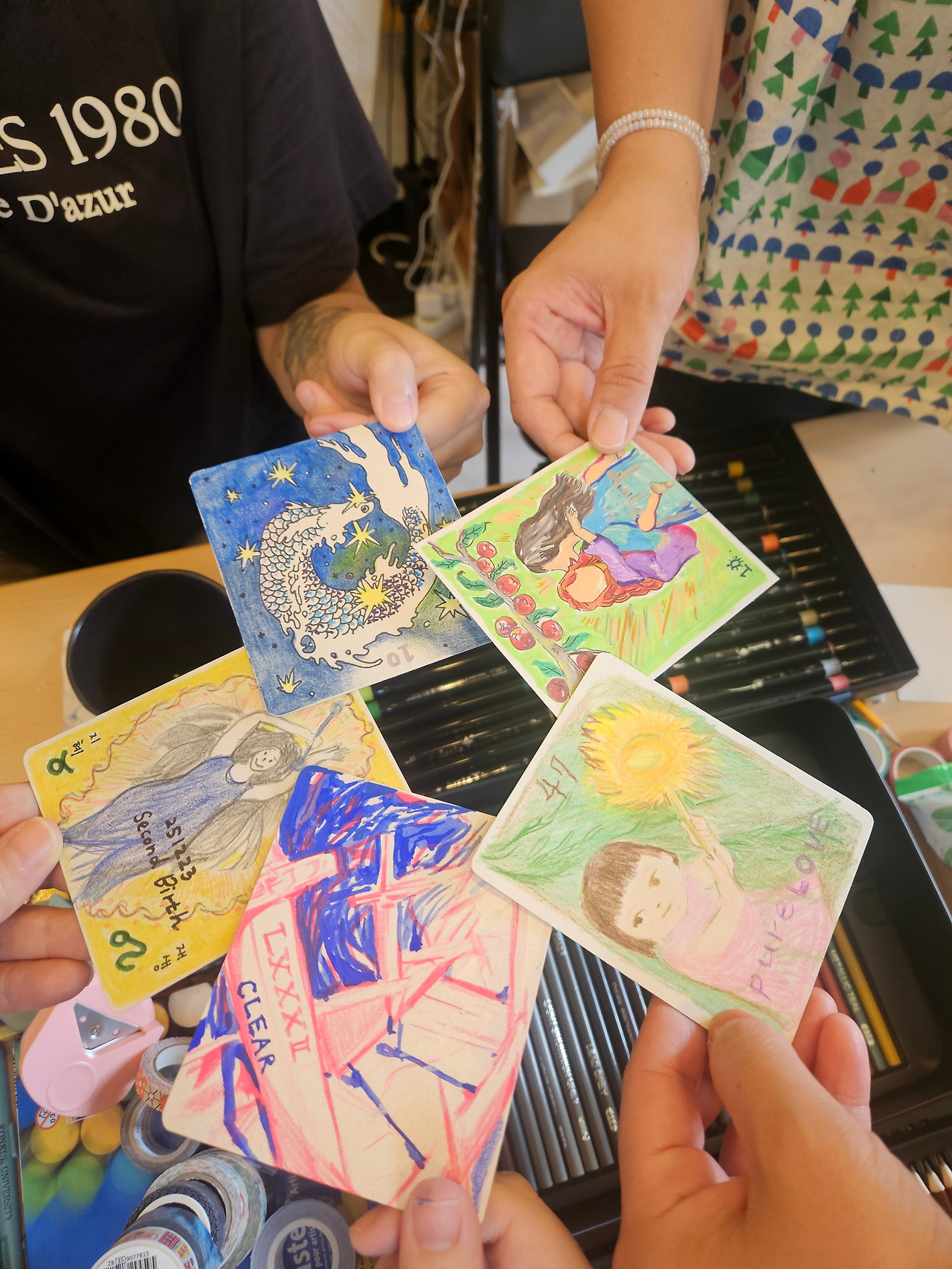 나만의 타로카드를 만들기 전에 함께 모여서 자기소개를 짧게 하는 시간을 가졌고, 이후에 타로카드를 소개하고 원카드를 뽑아 한해운세를 보는 시간을 가졌습니다. 카드를 뽑기 전에 중요한 나만의 질문을 골라 명확하게 타로카드가 답할 수 있는 질문을 정하기도 하였습니다. 막연하게만 느꼈던 마음 속의 고민을 문장으로 다듬어서 명확하게 질문해보니, 내 스스로 느끼고 있던 마음의 짐을 조금은 제대로 확인하는 기분이 들었습니다.