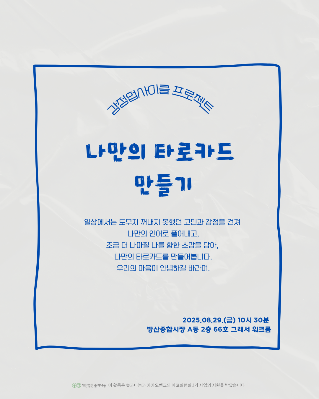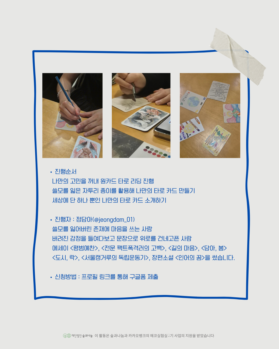 인스타, 블로그 등을 통해 감정업사이클프로젝트 나만의 타로카드 만들기 워크샵 참여자분들을 모집하였습니다. 함께 모인 사람은 총 7명이었습니다.