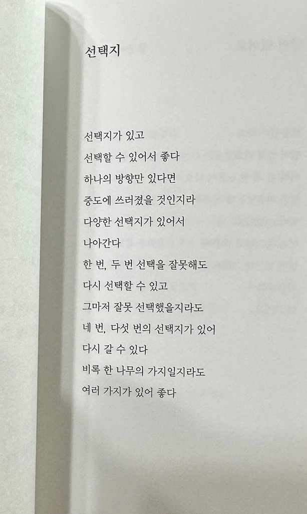 가방에 넣고 버스나 지하철을 탈 때, 한 편씩 읽어보았다. 담백하고 소탈한 생각이 담긴 책이었다. 강이랑 시인의 언어들은 일상의 사소한 순간들을 포착하였다. 그 순간들마다 만난 자연과의 대화로 이루어진 노랫말이었다. ‘선택지’라는 작품은 선택이란 한 나무의 가지에서 뻣어나가듯 여러 가지의 선택지가 나와 펼쳐나갈 수 있다고 말한다. 다양한 선택지들을 마주하고 그 갈래길에서 내가 느꼈던 불안감을 달래주는 말이었다.