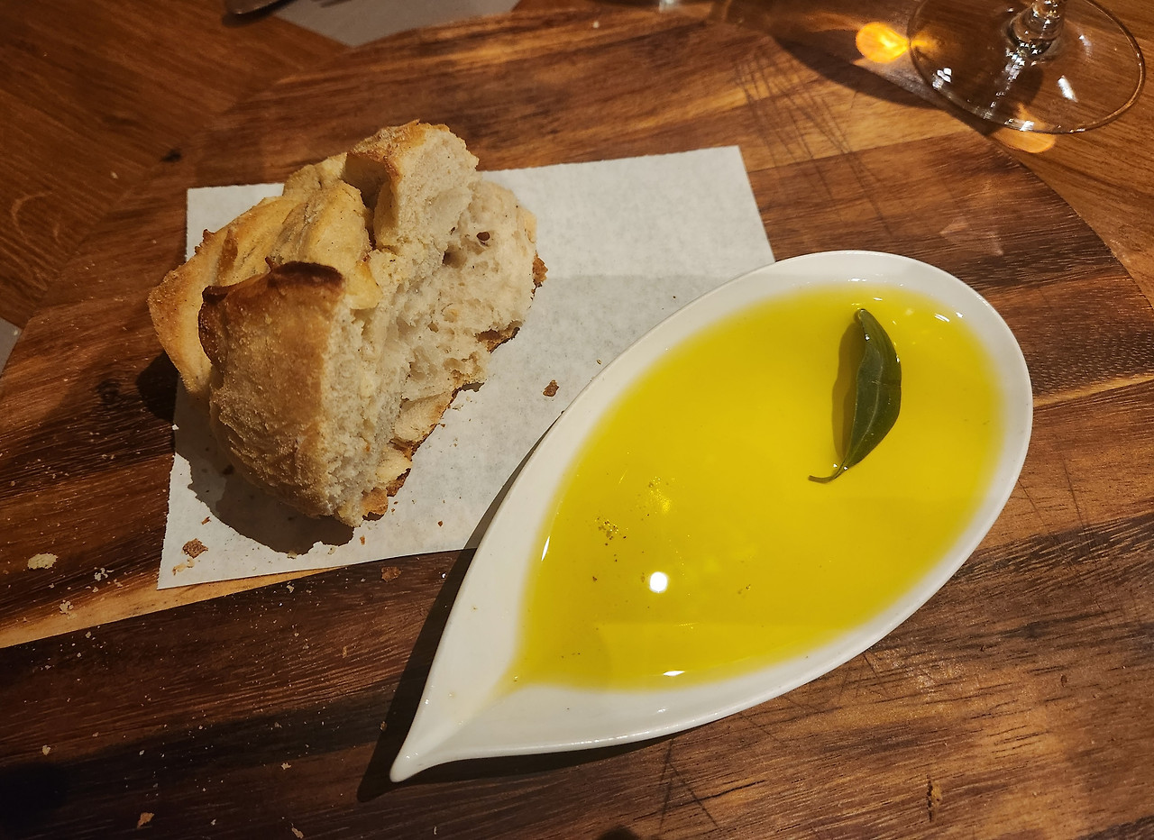 이곳에서는 각 지역 올리브오일을 시음해 보고 구매할 수도 있다. 시음하기 위해 빵을 찍어 먹는 오일 6유로짜리를 주문했다. 비싼 편이지만 먹어볼 만하다. 오늘 구입한 올리브오일같이 매콤함이 강하다. 첫 번째 수확한 올리브와 두 번째 수확한 올리브, 블랙올리브오일 맛이 다르고 가격도 다르다. 처음 수확한 올리브오일의 맛이 가장 좋다고 한다.