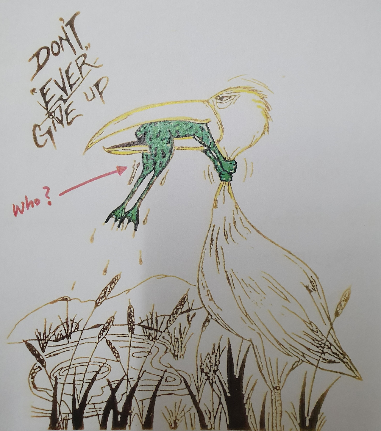이 그림을 오래도록 간직하고 열정이 식은 것 같다면 다시 꺼내봐라. 어떠한 어려움이 있어도 당신들은 살아남아야 한다. 호랑이에게 잡혀가도 정신만 차리면 살 수 있다고 했듯 아마도 왜가리에게 반쯤 먹힌 청개구리나 호랑이에게 잡혀간 사람이나 처지는 비슷할 듯하다. 우리 회사에서 힘들다고 한다면 퇴사 후 편한 회사를 찾지 못할 것이다. 열정을 다해서 살아남으려 한다면 주위에서 도와줄 것이니 열심히 해야 한다.
