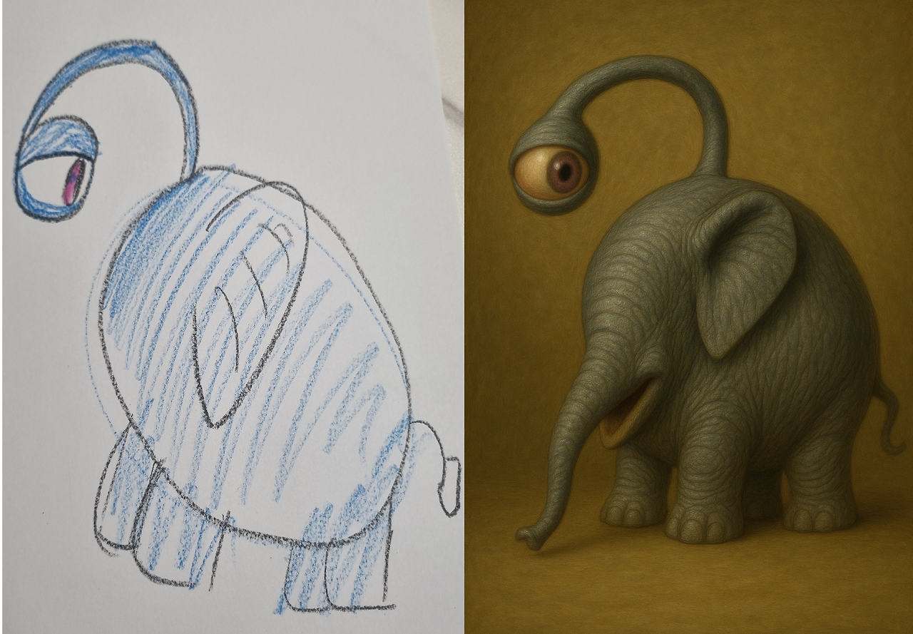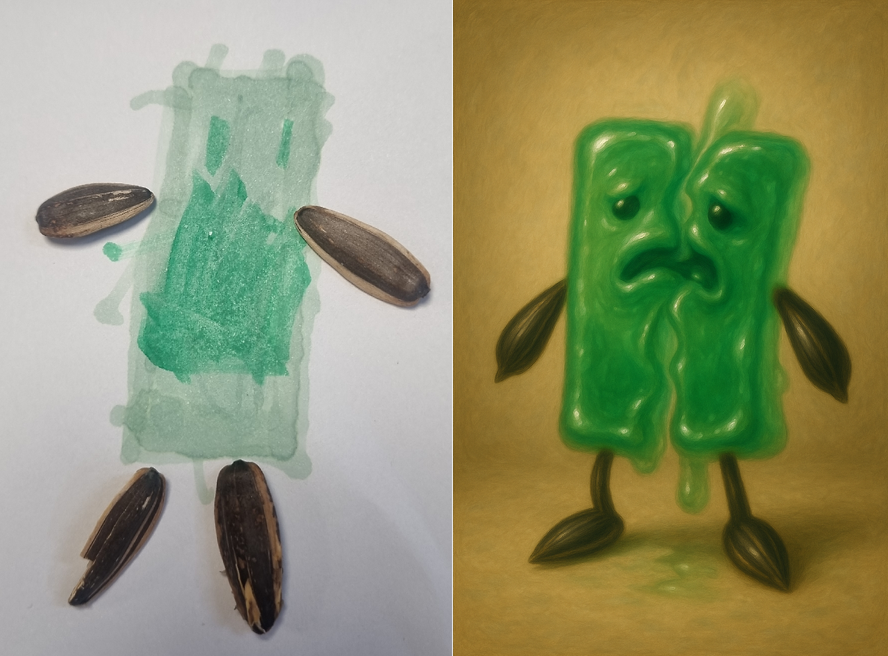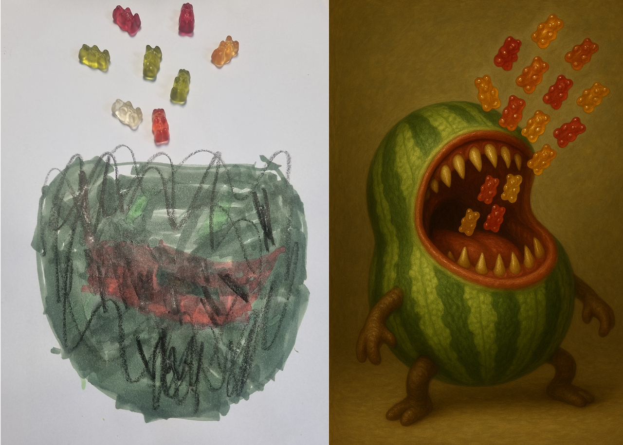 얼마 전, 모두가 지브리 스타일로 자기 얼굴을 변환해 보던 그 열풍이 떠올랐다. 어쩌면 아이들이 그린 괴물 그림도 이미지로 만들어볼 수 있을 것 같았다.