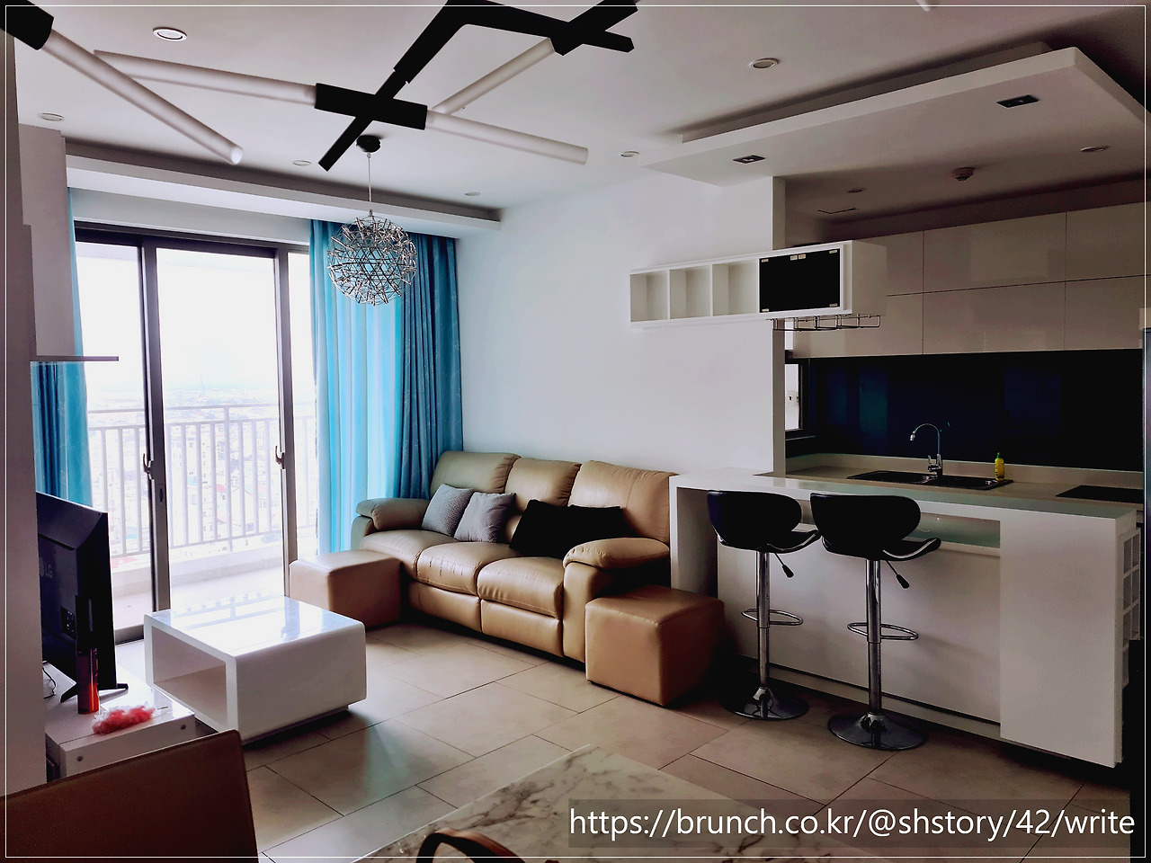 집 문을 열자 거실이 펼쳐졌다. 전면 창으로 도시가 보였고, 대리석 식탁이 놓인 거실은 생각보다 넓었다.