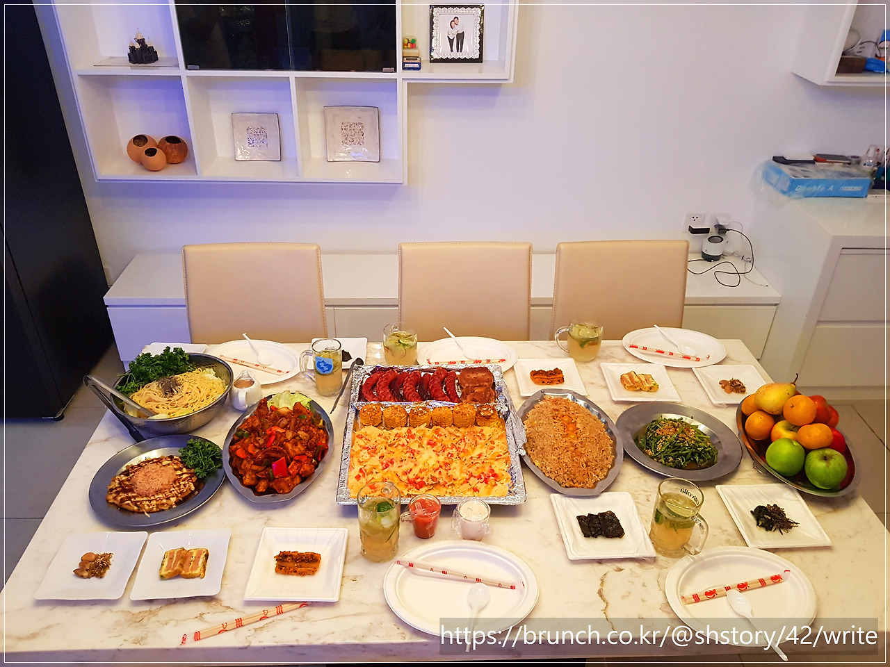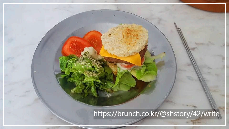 다음 날 아침, 아내가 조식을 준비했다. 버거와 샐러드, 과일, 커피. 대리석 식탁 위에 정갈하게 차려졌다.