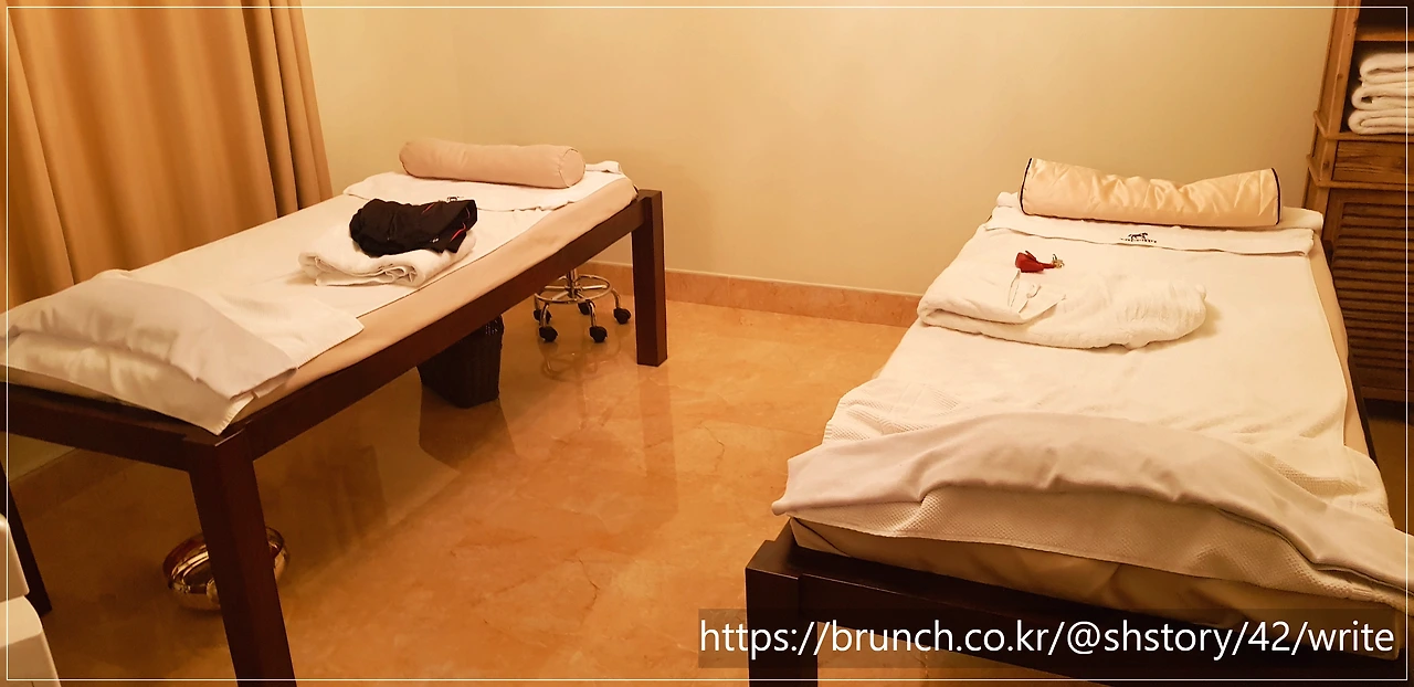 우리는 가운으로 갈아입고 문을 나섰다. 그리고 그때 비로소 이해했다. 이 층 전체가 우리를 위한 공간이었다. 매니저가 차례대로 안내했다. 샤워 공간, 스팀 시설, 케어룸, 마사지룸. 모든 시설이 이 층에 있었고, 우리는 준비될 때마다 다음 공간으로 이동했다. 아내가 감탄했다.